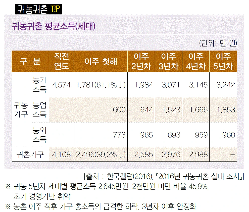 또 더 중요한 요소는 귀농귀촌 전후 소득구조이다. 조사 결과를 보면 귀농 직전 연도 평균 소득은 년 4,574만 원에서 귀농 1년 차에는 년 1,782만 원이며 이 중 농업소득은 600만 원으로 조사되고 있다.