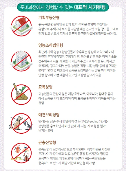 때문에 아무리 친한 지인이나 관련 광고, 교육 등에서 참여를 유도할지라도 꼼꼼히 따져보고 결정해야 한다.유사사례를 경험하는 경우에는 귀농귀촌종합센터(1899-9097)로 문의 후 상담하길 바란다.
