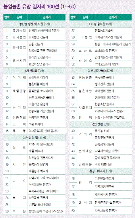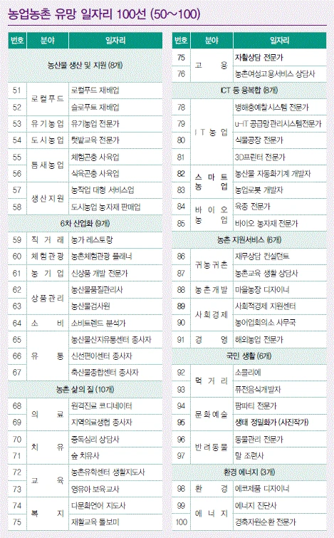 조금의 발품과 노력이 동반된다면 농촌에서 취업은 얼마든지 가능하다. 도시에서처럼 치열한 경쟁이 아니라 자연과 함께하면서 몸과 마음은 풍요로워지는 일자리가 농촌에도 다양하다. 몇 년 전 농촌진흥청에서 발표한 농업농촌 유망일자리 100선을 보면, 직능별로 다양한 일자리가 기다리고 있다.