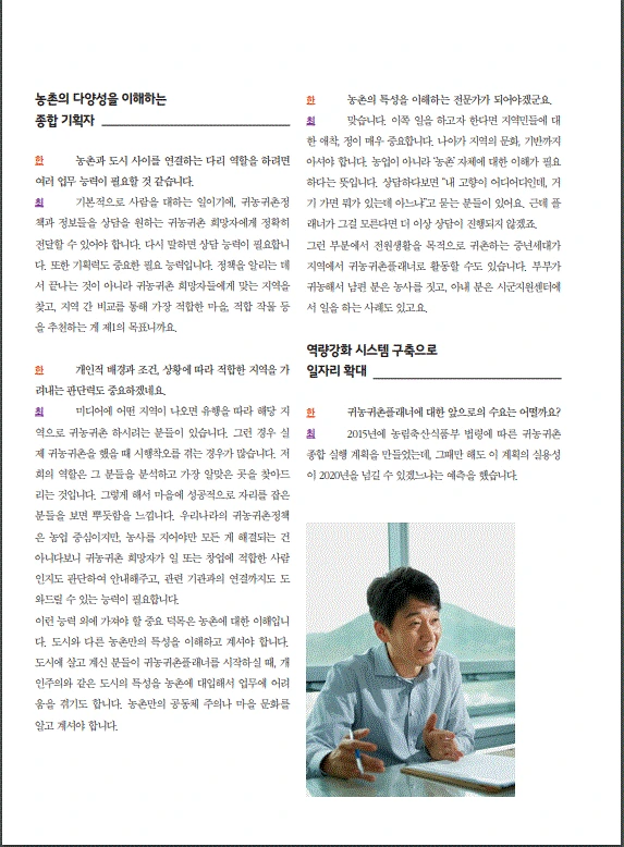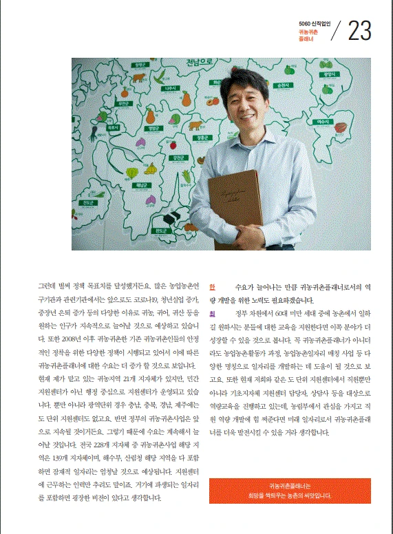 귀농귀촌 플래너, 귀농귀촌 희망자의 길잡이로 광역단위 귀농귀촌지원센터와 기초지자체 귀농귀촌지원센터 상담사, 귀농닥터, 전문강사 등 다양한 분야에서 활동하는 직업으로 농촌진흥청 농업농촌 유망일자리, 고용정보원 중장년 신직업으로 권장되고 있습니다.