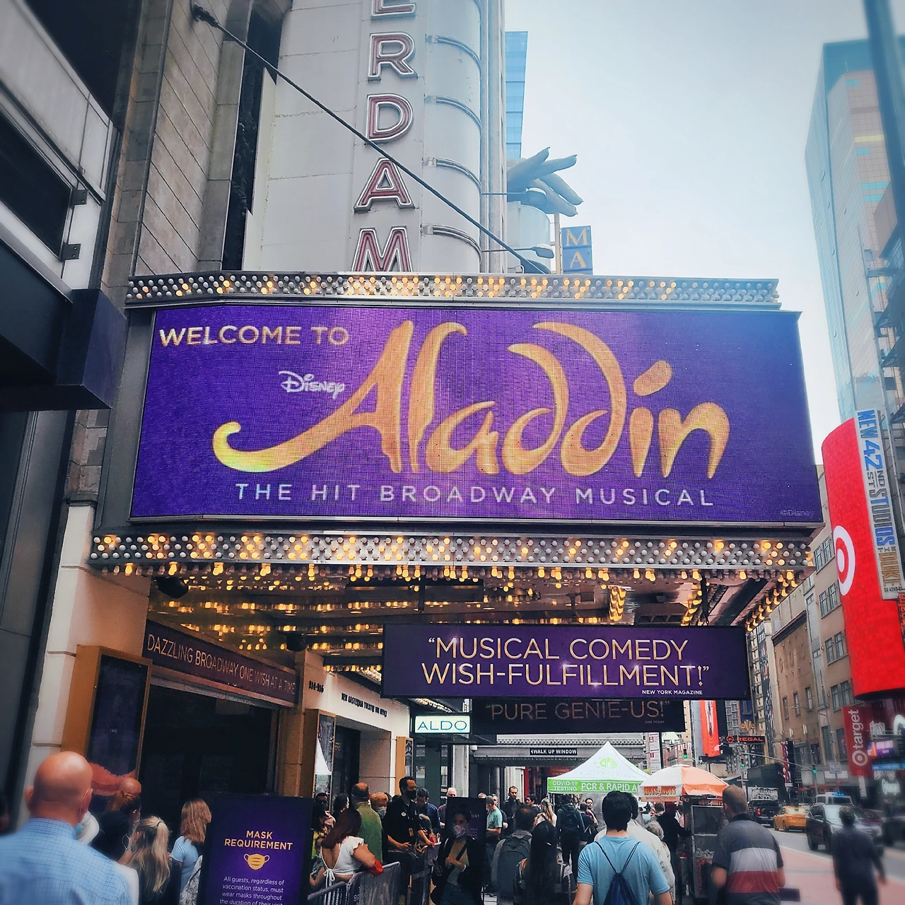 § 다시 찾은 브로드웨이. 코로나가 좀 잦아든 탓인지 작년 말에 왔을 때보다 관광객이 훨씬 많다. 알라딘이 노래를 굉장히 잘하는데 반해 재스민은 가창 실력이 부족해서 아쉬웠지만 노래들이 모두 익숙한 데다 내용이 흥겨워 재밌게 관람했다.