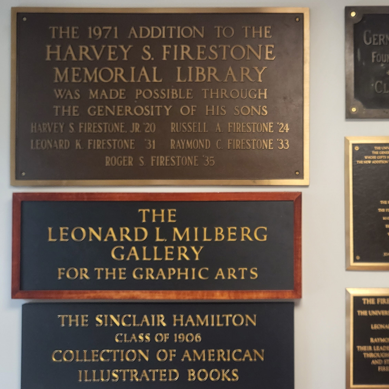 § 파이어스톤 도서관 이름의 주인이신 하비 파이어스톤 씨의 기부 명판 및 다양한 기부자 명판들. 기부금 운용을 워낙 잘해서 서브프라임 모기지 사태 때도 예산을 한 푼도 삭감하지 않고 지나갈 수 있었다고 한다. 오른쪽은 귀중 자료실로 이곳 역시 벽의 한쪽은 옛 건물이 그대로 남아 있고, 다른 한쪽은 현대적으로 리모델링되어 신구의 조화를 이루고 있다. 사진에는 안 나왔지만 천정은 유리로 이루어져 있는데 햇빛의 강도에 따라 자동으로 색이 진해지기도 하고 투명해지기도 해서 최대한 전기를 사용하지 않고 조도를 유지할 수 있도록 고안되었다고 한다. 오래도록 지식이 지속될 공간에 어울리는 지속 가능한 설계에 감탄했다.