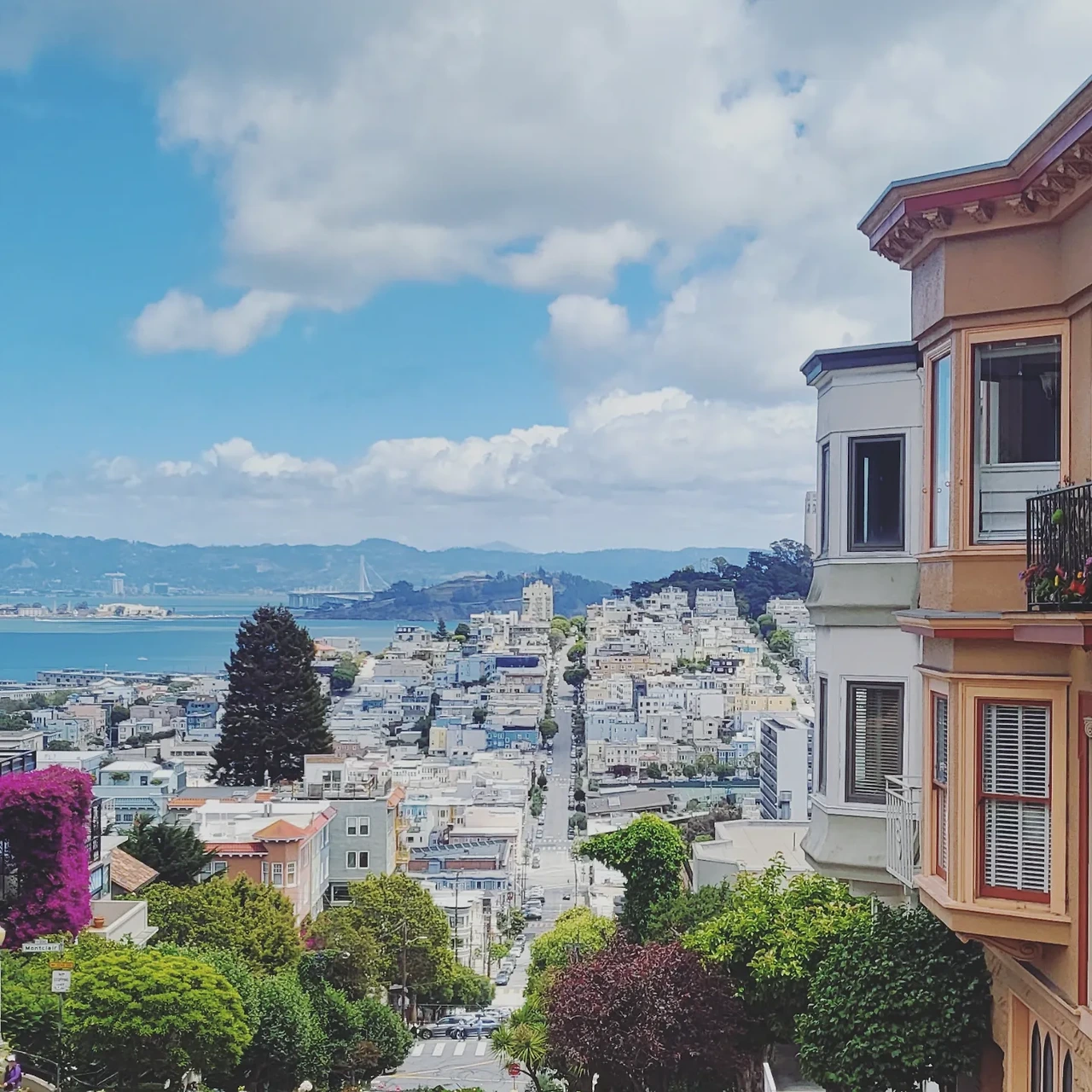 § 아기자기한 집들과 바다가 한눈에 내려다 보이는 롬바드 언덕. 케이블카는 롬바드 거리와 차이나타운 등을 비롯한 주요 관광지에 서기 때문에 편리하지만 가격이 1회 탑승에 무려 8달러나 해서 자주 타기는 부담스럽다. 요금은 샌프란시스코의 교통카드인 클리퍼 카드로 지불해도 되지만 탑승 후 차에서 표를 구입할 수도 있기 때문에 급하면 일단 차에 올라타도 된다.