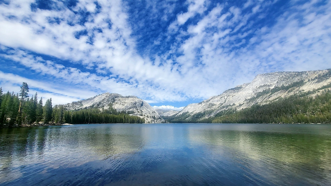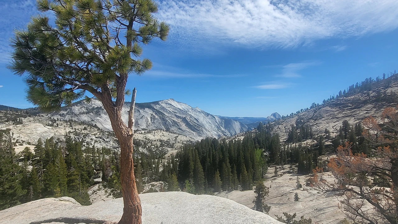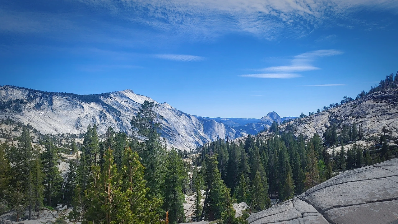 두 번째 행선지는 요세미티 빌리지에서 한참 차로 이동을 해야 갈 수 있는 타나야 호수와 옴스테드 포인트이다. 거리는 좀 멀지만 산 위를 오르는 길이라 도중에 뷰포인트가 여러 군데 있어서 풍경을 조망하기 좋을 것 같아 겸사겸사 가보기로 했다. 아니나 다를까 터널을 지나자마자 나타나는 풍경에 숨이 멎는다. 드넓게 펼쳐진 초록 숲 너머로 웅장한 산들이 병풍처럼 드리워져 있는 풍경이 한국의 산들과 닮은 듯하면서도 묘하게 달라서 끊임없이 눈길을 끈다. 처음에는 예쁜 곳만 보이면 무작정 차를 세우려 했지만 그러다가는 날을 샐 기세라 두 눈에 열심히 풍경을 담으며 차를 달렸다.