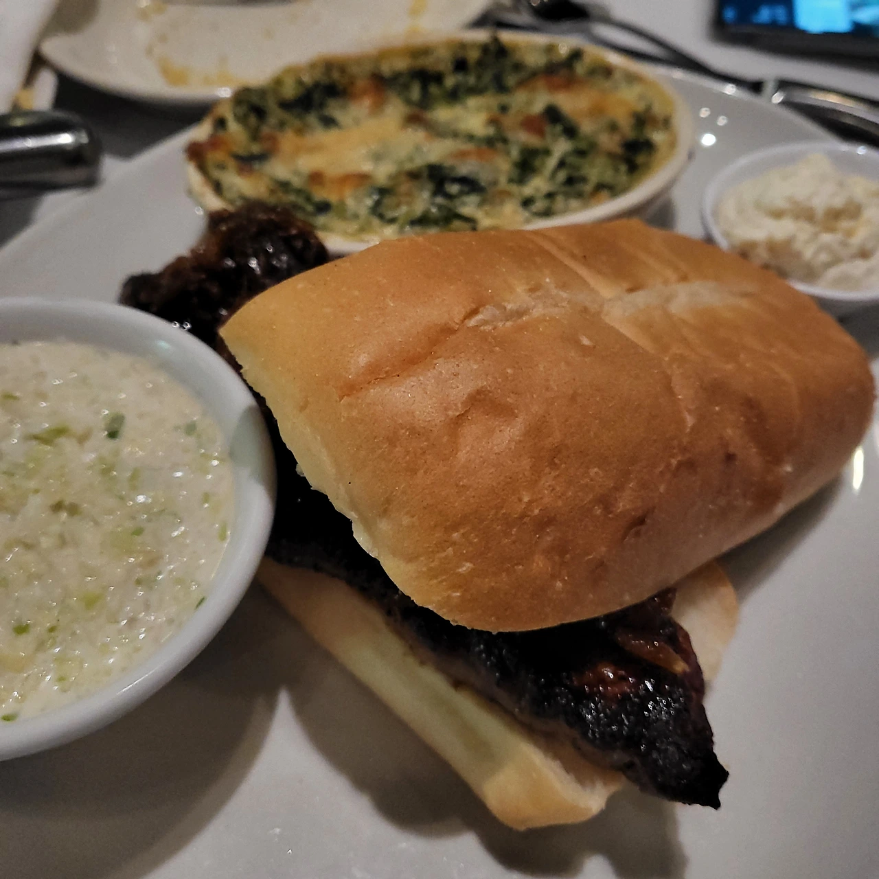 립이 유명하다고 해서 찾아간 칼슨 립. 보통 립은 뼈를 빼면 먹을 게 별로 없어서 하프 립 하나에 스테이크 샌드위치, 옥수수빵을 주문했다. 그런데 생각보다 다들 크기가 커서 양이 너무 많았다. 립 맛집이라더니 확실히 립은 부드럽고 소스도 감칠맛 있어서 입에 잘 맞았으나, 스테이크가 통째로 들어간 샌드위치는 약간 질겼다. 립 맛집에서는 립만 먹어야 하나보다. 옥수수빵도 고소하니 맛있었는데 양이 많아서 남은 빵은 포장해 와서 나중에 간식으로 먹었다. 여기는 사이드 디쉬들도 다 맛있어서 시금치 수프, 감자 그라탱 모두 아주 훌륭했는데 배가 불러서 거의 남겨야 해 무척 아쉬웠다. 역시 미국에서는 메인 요리는 하나만 주문하고 배 상태를 봐가며 추가 주문해야 한국인 양에는 부담이 덜 가는 것 같다.