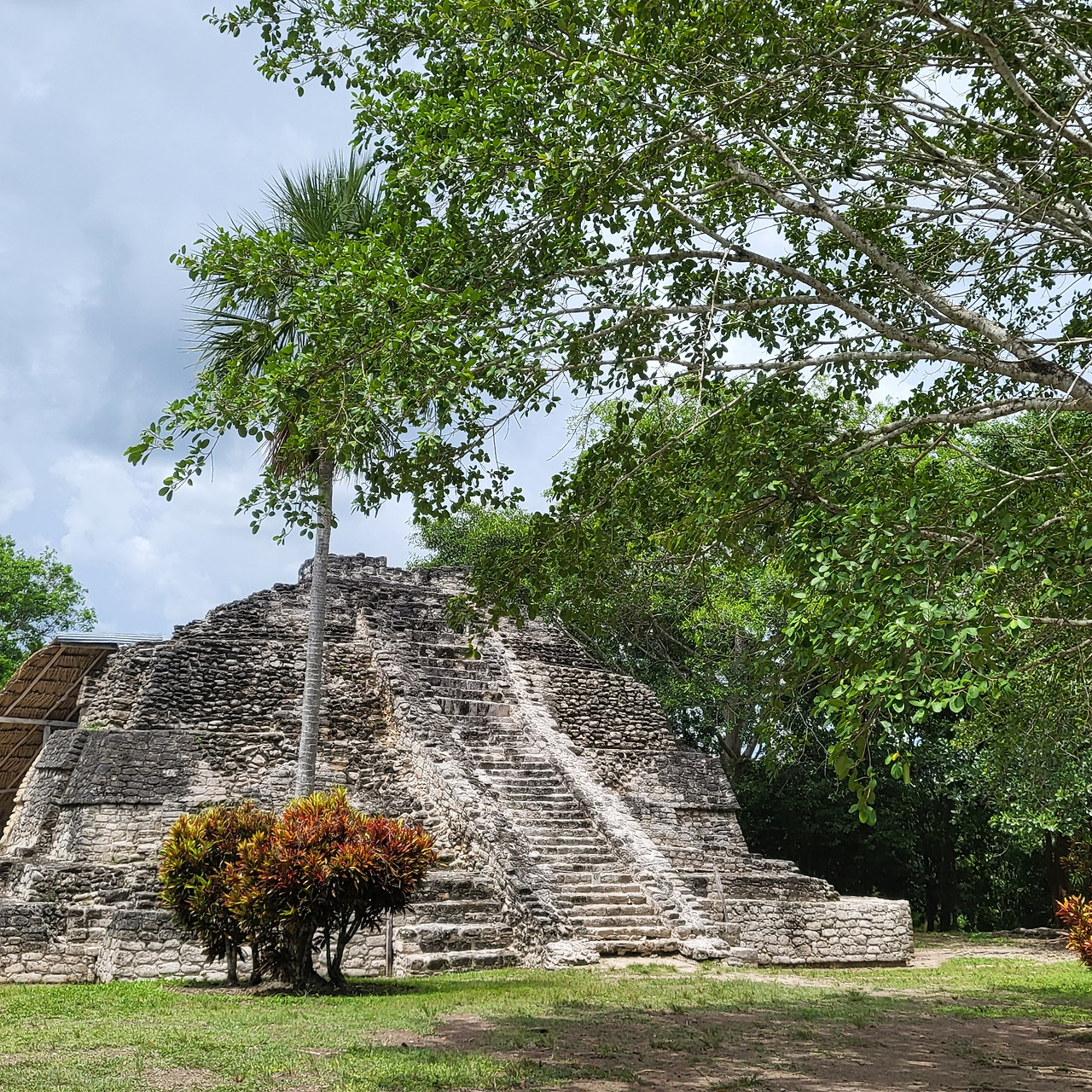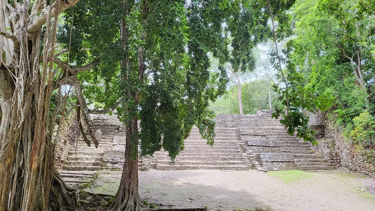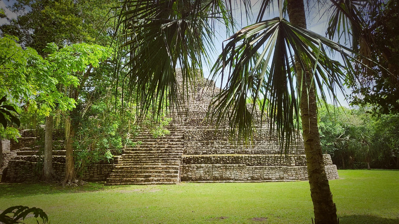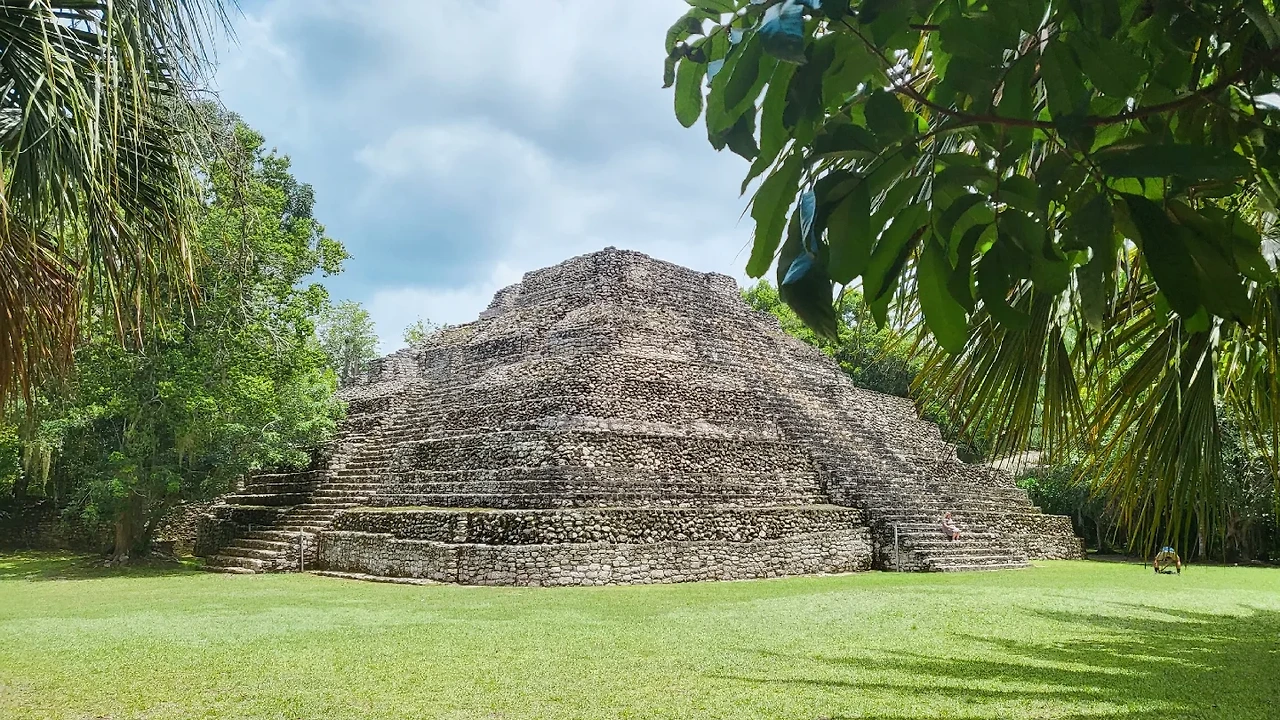 § 차코벤의 마야 피라미드. 이 사진에는 비교가 되는 대상이 없어 크기가 실감이 나지 않지만 사람이 앞에 서면 비로소 규모가 느껴진다.큰 계단 한 단이 성인 남성의 가슴~어깨 높이쯤 된다.