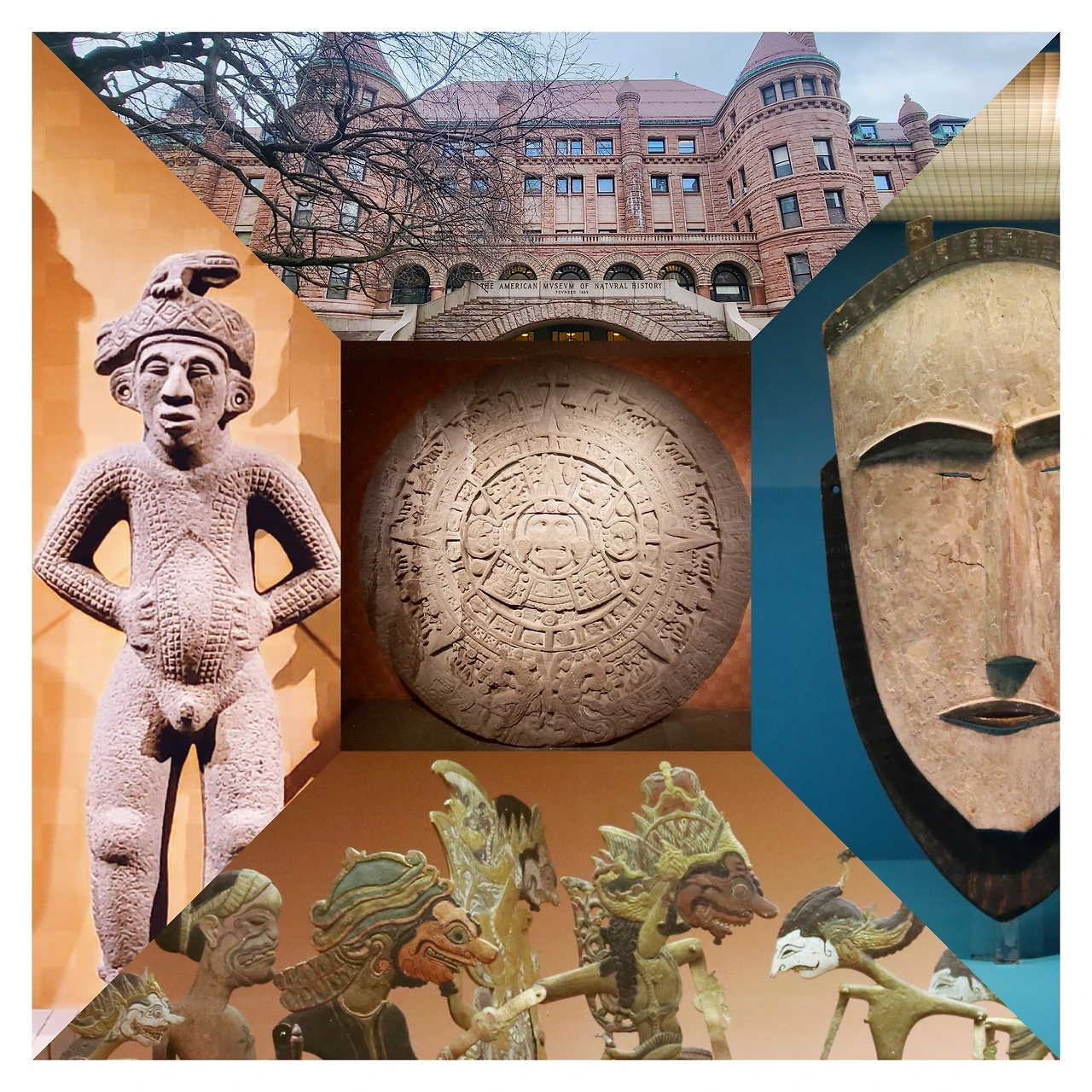 § (위) 정면인 줄 알고 찍었는데 알고 보니 뒤편이었던 박물관 건물 전경. (가운데) 보자마자 "달력이다!"하고 뛰어갔는데 아래를 보니 달력이라고 잘못 알려진 태양석이라는 설명이 붙어 있었다. 모든 것을 책으로만 배우면 안 된다는 교훈을 준 유물. (나머지) 각각 중남미, 파푸아 뉴기니, 발리의 유물. 파푸아 뉴기니 가면은 마가렛 미드의 기증품이다. 유물들을 가만히 바라보고 있으면 전혀 교류가 없는 지역의 유물들이 묘하게 비슷하다는 사실에 놀라곤 한다. 인간의 예술적 본능에는 일맥상통하는 부분이 있는 듯 모두가 묘하게 닮아 있으면서도 아름답다.