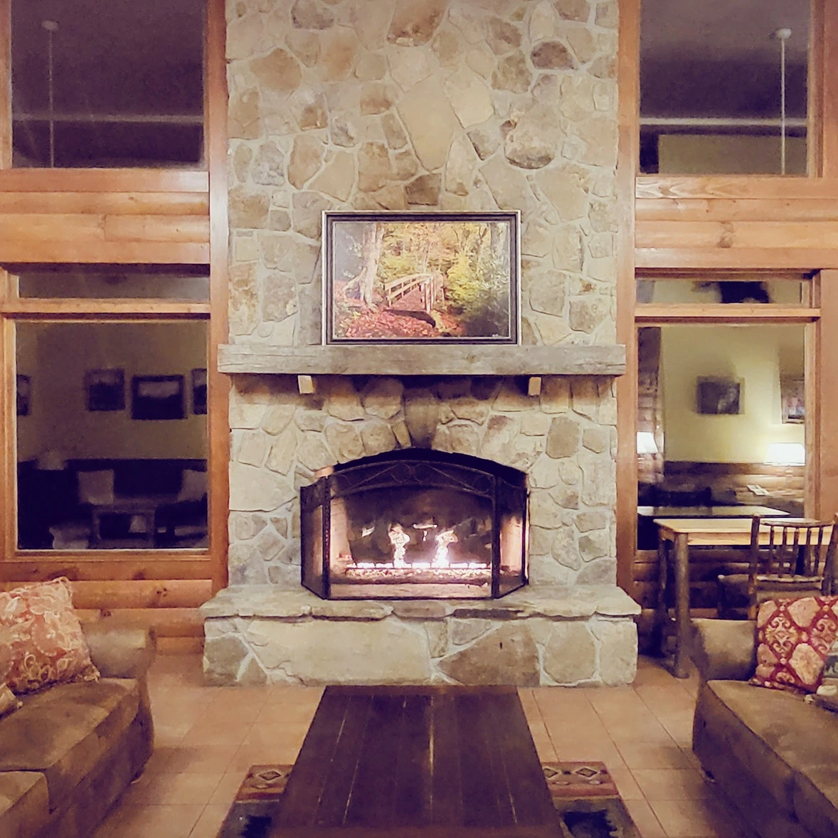 § <브래스타운 볼드>로 가는 길의 나무들이 눈에 뒤덮인 모습. 조지아주에서 이런 설경을 보기는 쉽지 않다고 한다. 한편 숙소는 묻지도 따지지도 않고 그냥 <브래스타운 볼드>와 제일 가까운 곳으로 예약했는데, 도착해보니 채투지 호수가 한눈에 보이는 아주 좋은 곳이었다. 시설은 다소 낡았지만 저렴한 데다 벽난로가 아늑하고, 무엇보다 1층 레이크 뷰 룸에서 바로 정원으로 나갈 수 있어 편하게 풍경을 즐길 수 있어 좋았다.