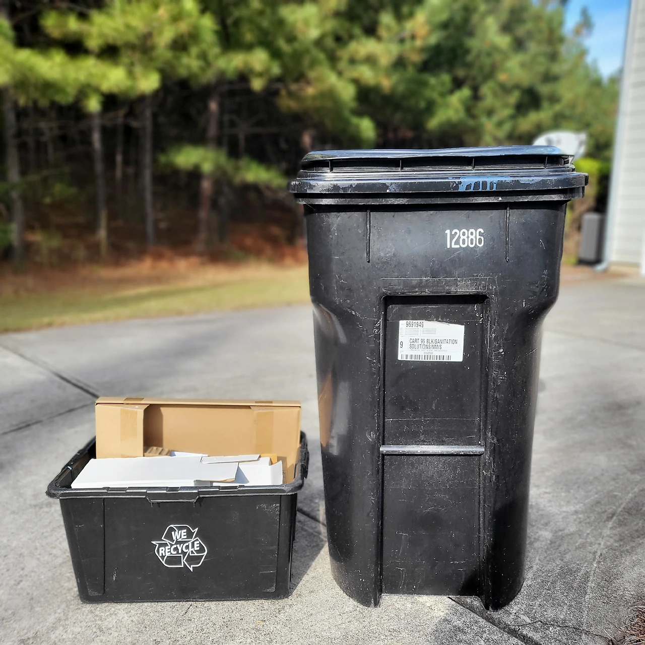 § 집집마다 구비된 일반쓰레기통과 재활용 쓰레기 상자. 재활용 쓰레기를 품목별로 구분해서 내놓는 한국과 달리 이곳에서는 따로 분류하지는 않고 모두 재활용 상자에 함께 넣는다. 쓰레기통들은 평소에는 차고에 넣어놨다가 매주 정해진 요일에 집 앞에 내놓는다. 한편, 한국에서 기껏 가져간 장바구니는 쓸 기회가 없어 비닐을 모아 놓는 용도로 전락하고 말았다.