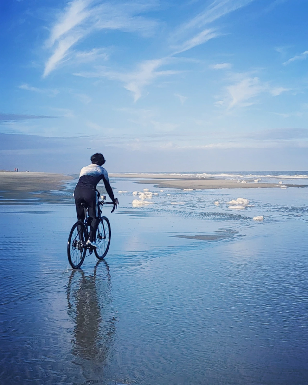 § 해변 곳곳에 바닷물이 고여 있는데 깊지는 않아서 물 위로도 걸을 수 있고 자전거도 탈 수 있다. 땅과 바다와 하늘이 모두 푸르른 시원한 풍경.