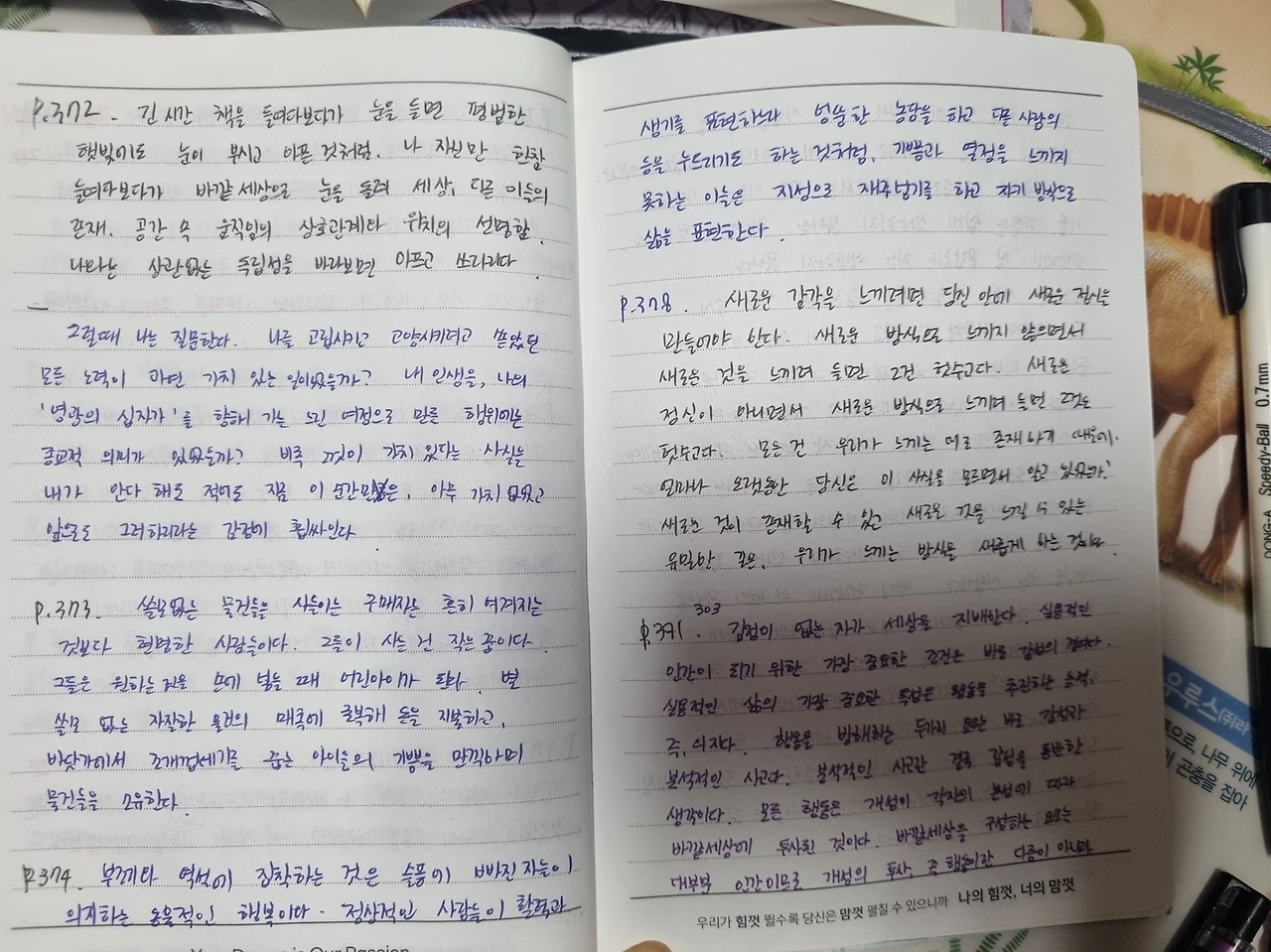 p. 308 삶에 아픔이 부족하지 않도록, 반드시 치욕이 주어지도록, 삶에서 감당해야 할 슬픔의 몫을 꼭 치르도록 영혼은 그런 충격을 견딜 수밖에 없는 것 같다.