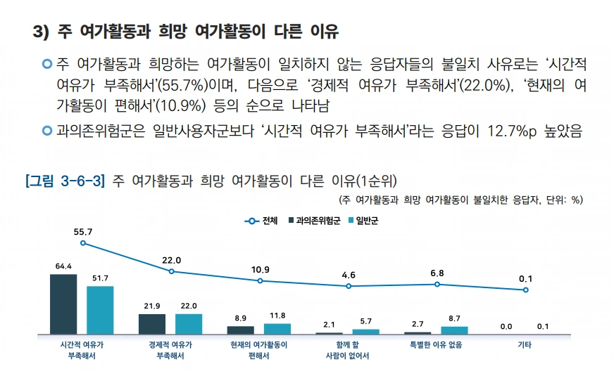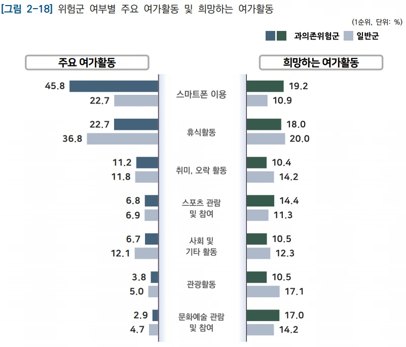과의존 위험군 청소년이 가장 하고 싶은 여가활동 1위는 '스마트폰 이용'(19.2%)이었지만, 2위는 '휴식'(18.0%),