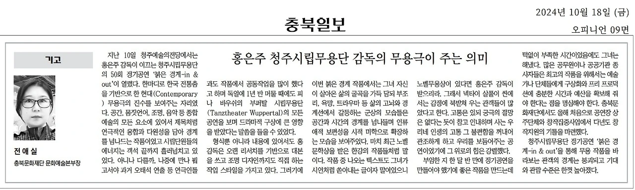청주시립무용단 정기공연 '붉은 경계-in & out'을 통해 무용 작품을 바라보는 관객의 경계는 붕괴되고 기대와 관람 수준은 한껏 높아졌다. 홍 감독이 그 작품의 가장 마지막 씬에서 무대의 극장막, 다리막 등 모든 막을 올리고 무대의 날것을 보여주었듯이 펄떡이는 물고기처럼 청주시립무용단의 날 것 같은 차기 작품을 설레며 기다려본다.
