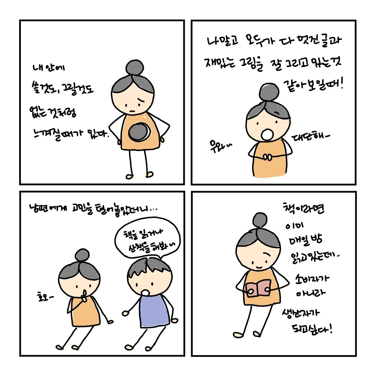 아니 남들은 평범한 일상도 맛깔스럽게 표현해서 꺼내놓던데 나는 왜 그럴만한 게 없지? 남편 욕할 때 말고는 나의 고민상담 대상 1위인 남편에게 물으니 책을 읽고 산책을 해보란다.