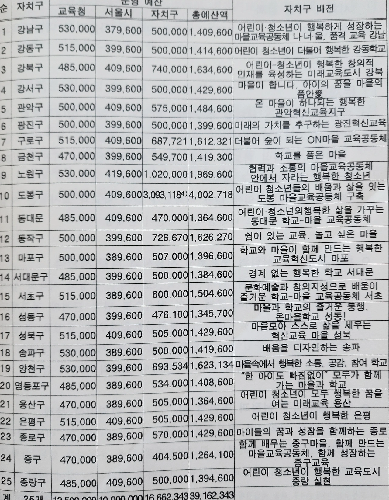 나는 교육혁신지구 취지에 적극 공감하지만 걱정을 많이 했다. 그 이유는 다음과 같다. 우선 서울교육청이 부족한 예산이나 정책사업을 혁신교육지구 예산에 끼워 넣는 예가 빈번해 근본적으로 교육혁신사업의 취지를 살리기 어려웠다.