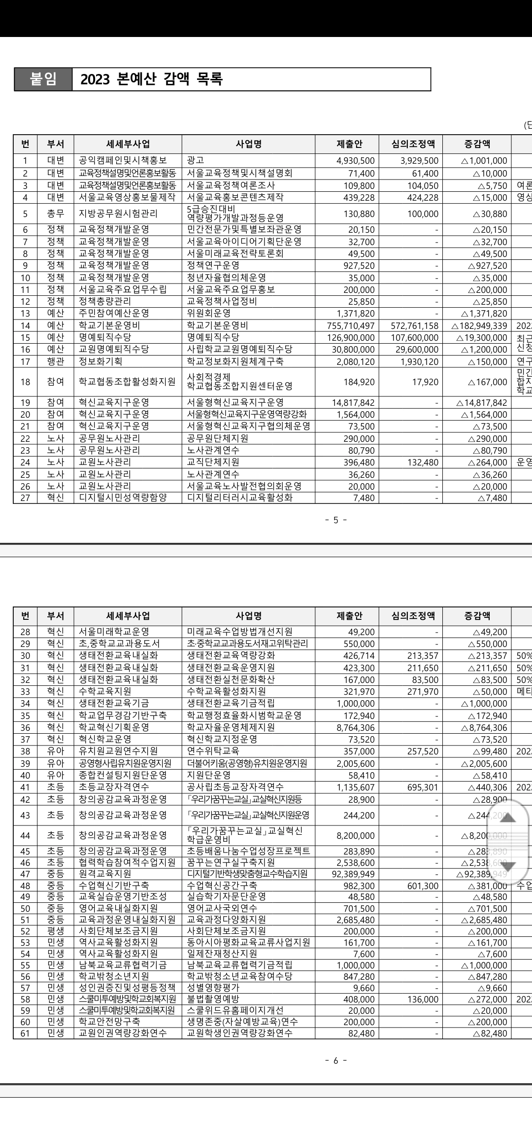 2023년 서울교육청 예산안은 12조 8915 억원이다. 이 예산은 지난해에 비해서 21.5% 2조 3029억 원 증가했다. 중앙정부 이전 수입과 부동산 관련 세금이 많이 늘어났기 때문이다. 그러나 예산이 늘어났는데도 혁신교육 지구 사업이 《아듀~ 혁신!!》이라는 이름으로 이별 파티를 한다. 서울시의회를 장악한 국민힘당 시의원들이 혁신교육지구 관련한 예산 148억 원을 전액 삭감했기 때문이다.