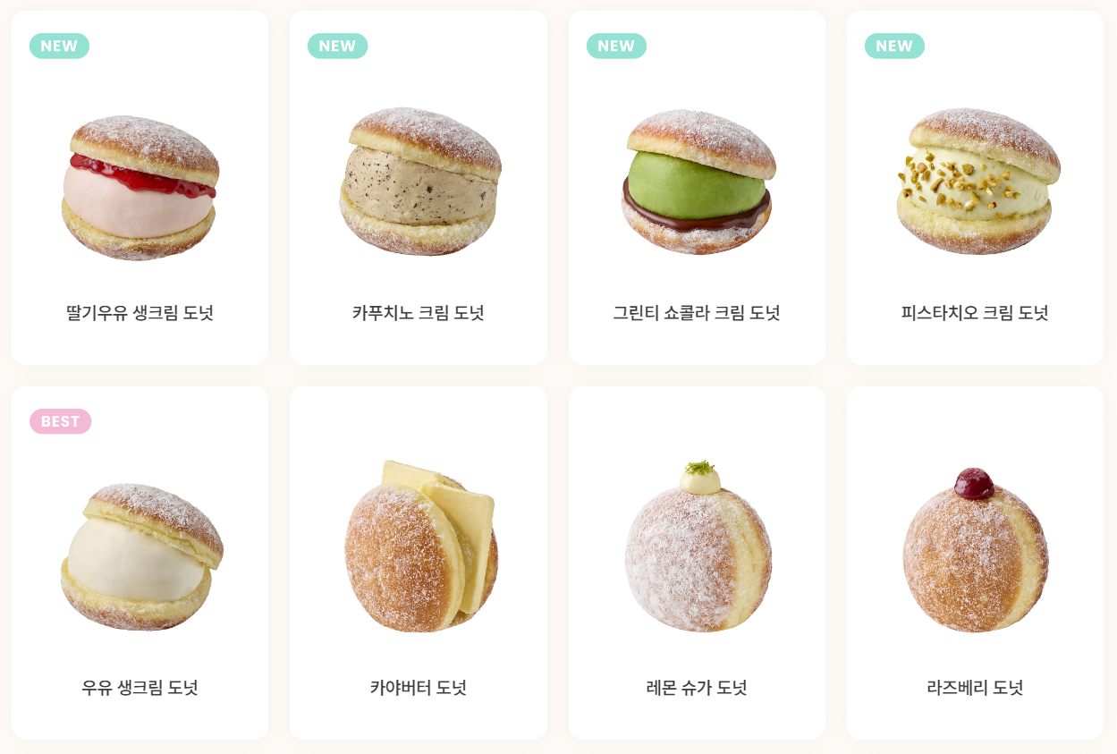 도넛이라면 딸기크림, 우유 크림, 커스터드 크림, 레몬 크림, 인절미, 피스타치오 도넛 등 다양한 맛이 있다.