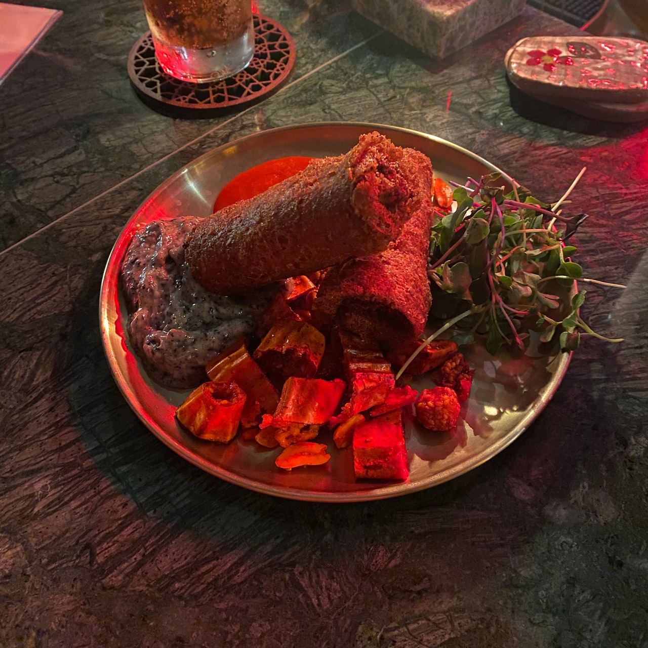 특히 시가는 총총의 시그니처 메뉴로 새우를 호밀빵에 말아튀긴 시가 형태의 요리인데 흑임자 소스와 같이 서빙되어 실제 시가를 떠올리게 하는 독특한 메뉴이다. 바삭한 겉면에 촉촉한 새우살이 맛의 기본을 잡아주고, 흑임자 소스와 잘 어울려서 맛이 조화롭다.