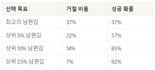 정리하자면 상위 5%의 선택을 하기 위해선 22%를 살펴보고 기준점을 고르면 되고 성공확률은 57%다. 마찬가지로 상위 10%는 85%, 상위 25%는 92%다. 상위 20%대로 가면 거의 성공한다는 뜻이다. 여기서 파레토의 법칙을 떠올려보자. 상위 20%가 전체 80%를 담당한다. 즉, 상위 20%의 선택이 나의 만족 80%를 채워줄 수 있다는 뜻이다.