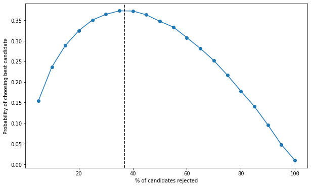 남자의 수 n, 최초 r 명의 지원자를 탈락 시킬 때 최상의 선택 확률을 계산 시 n이 커지면 확률 P가 37%에 가까워 진다는 것을 알 수 있다. 수학자들은 남자의 수 n에 대하여 최적의 데이트 전략은 1e 명 만나보는 것임을 증명했다. (1e=0.3678794 이다.)*