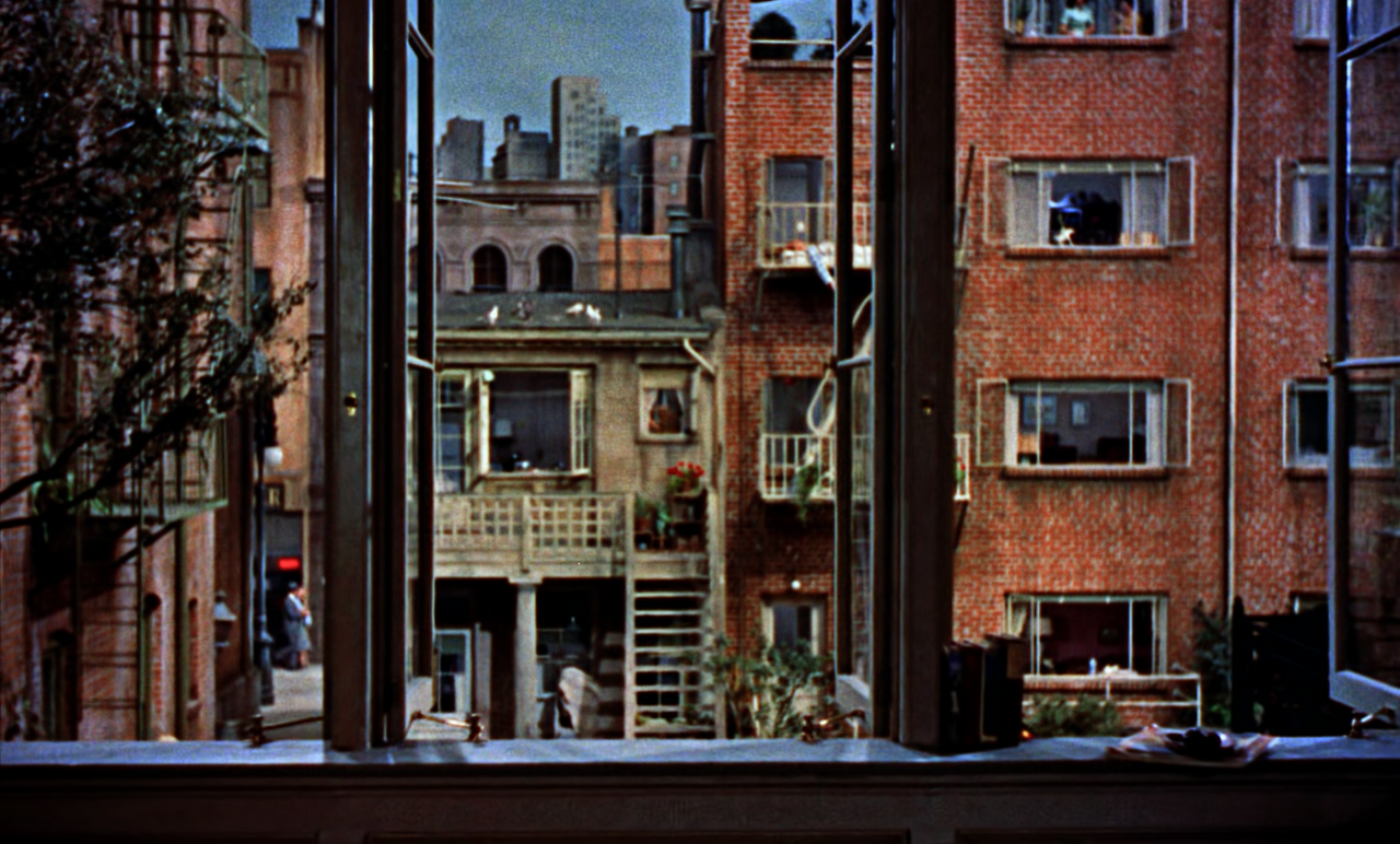 타이틀 시퀀스가 끝난 후 영화는 위에서 아래로 내려다보는, 혹은 창문 높이에서 전경을 둘러보는 샷으로 시작된다. 중앙의 작은 정원을 둘러싸고있는 여러 채의 아파트가 가깝게 붙어있는 배경이다. 집집마다 큰 창문이 있어서 집 안에서 이웃들이 무엇을 하는지 훤히 보여 궁금증을 자아낸다. 주인공 제프는 사진작가이다. 영화 초반에 그의 방을 비추면서 여러 사진과 잡지를 훑는 장면이 나오고 곧바로 전화가 걸려와 대화를 하는데, 이 때 그의 다리가 부러진 이유를 짐작할 수 있는 대사가 나온다. 짧은 대화 장면이지만 사진을 건지기 위해서 다리가 부러질 정도로 열심이었던 그의 직업 정신과 능구렁이같은 농담을 통해 그의 성격을 빠르게 파악할 수 있었던 효과적인 대사였다. 한 주만 있으면 깁스를 푸는 제프를 도와주는 간병인이 곧이어 등장한다. 간병인은 심심할 때마다 창 밖으로 사람들을 구경하는 제프의 취미를 그리 탐탁치 않게 여기는 듯 보인다. 제프의 여자친구의 리사는 패션 업계 종사자로 뛰어난 미인이다. 제프의 눈에는 그녀가 너무 완벽해보였기 때문에 자신에게 과분하다고 느껴 그녀와의 결혼을 고민하는 중이다.