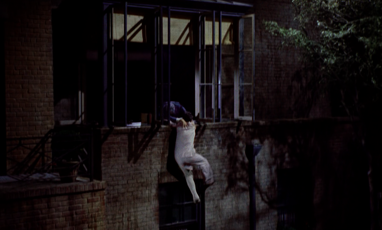 맞은 편에 살고 있던 제프에게 오는 동안에 깔려있던 배경음악이 사라지고 오로지 제프가 움직이는 소리에만 집중한다. 달그락거리는 소리와 함께 복도의 불이 꺼지고 서서히 외판원이 서서히 제프를 옥죄어오는 긴장감을 느낄 수 있었다. 결국 마주한 외판원에게 불이 꺼진 방에서 카메라 후레쉬를 비추며 그의 눈을 멀게 하며 저항했지만 크게 힘을 쓸 수 없었던 제프는 그에게 붙잡혀 창문의 난간에 매달리는 상황까지 온다. 하지만 때맞춰 온 도일과 그의 부하들이 외판원을 체포하고 제프를 받아주어 위기를 모면하게 된다. 영화는 두 다리 모두 깁스를 한 제프가 의자에서 쉬는 모습 후로 침대에 평화롭게 앉아있는 리사의 모습을 보여주며 끝난다.