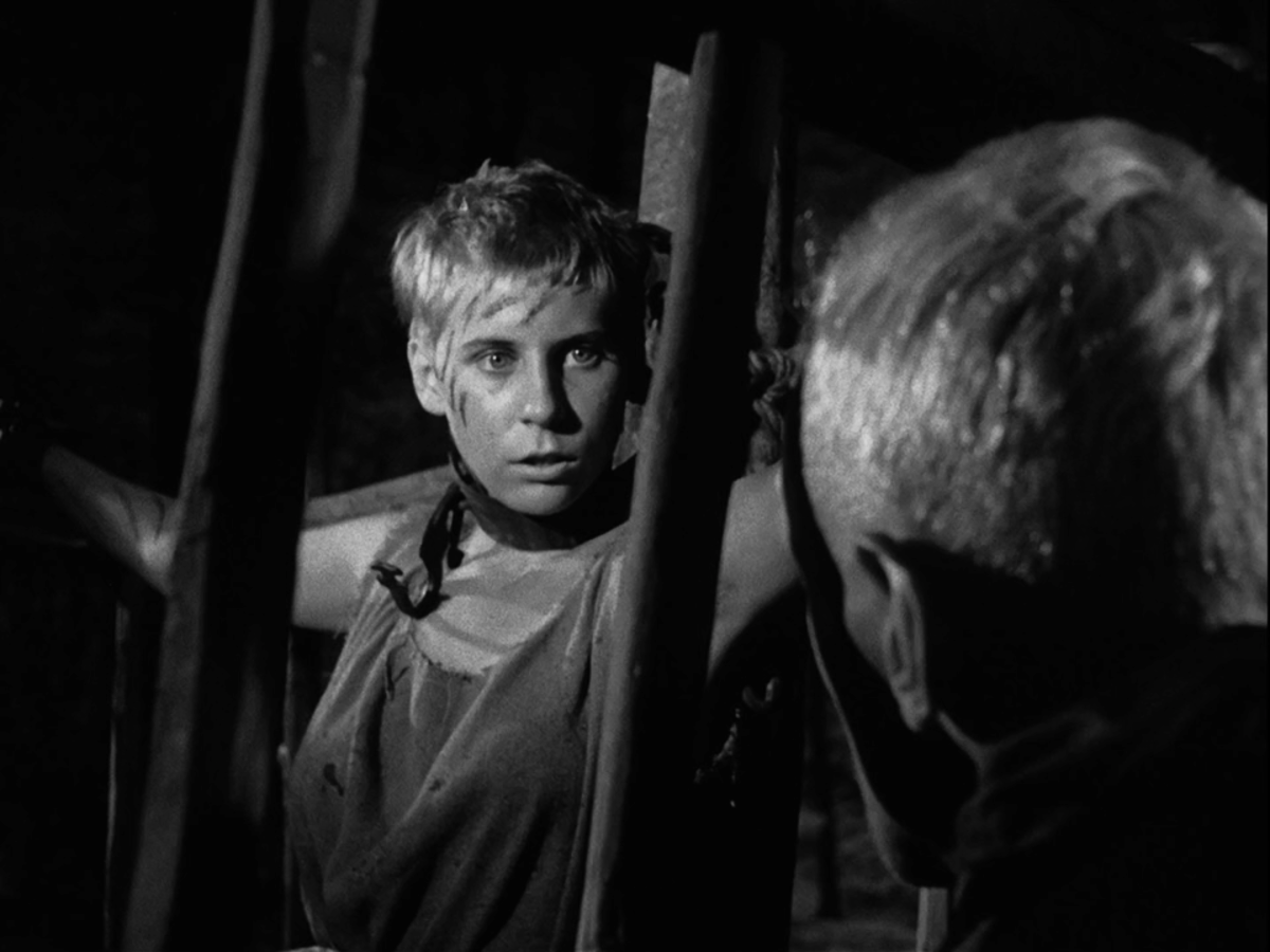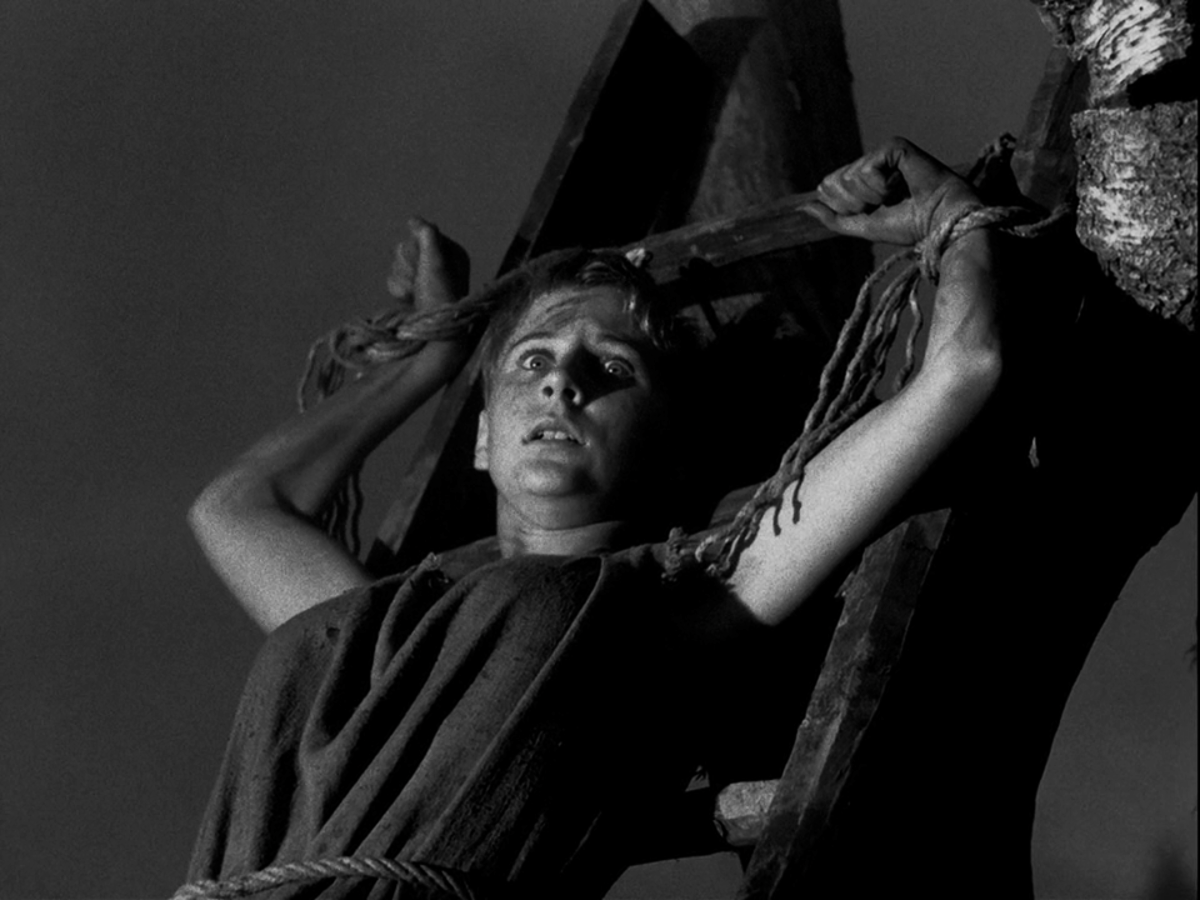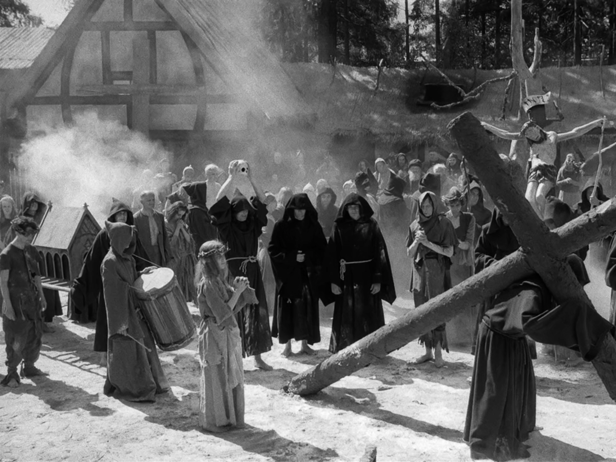 일행은 밤에 산 속에서 화형식을 하러 가는 또 다른 일행을 만난다. 얼마 전 화형을 당할 것이라고 하였던 그 여자임을 확인한 블로크는 그녀에게 정말 악마와 거래했냐고 질문한다. 여자는 자신의 눈을 보면 알 수 있다고 하지만 블로크는 두려움 외에는 아무것도 보이지 않는다고 답한다. 그의 대답에 놀란 여자는 모든 사람들이 자신의 눈 안에 악마가 있다고 이야기 했다고 말하는데, 이 대사 전까지 죽음에 대해 아무런 두려움이 느껴지지 않았던 그녀에게서 눈동자의 떨림이 느껴지기 시작했다. 결국 그녀는 무고하지만 타인의 강요에 의해 악마가 되어 죽게 되는 것이다. 옌스는 그녀를 안타까워 하며 그 누구도 그녀를 돌보지 않았다고 한탄한다. 그 사건을 겪은 블로크는 다시 한 번 신의 존재에 물음을 가지며 일행은 다시 길을 떠난다.