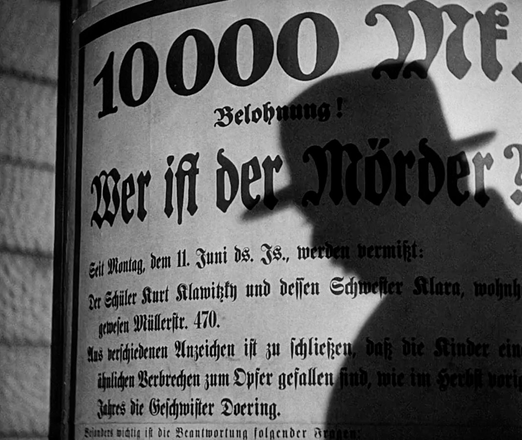 영화는 연쇄 살인마에게 잡히면 죽는다는 유행가를 부르는 아이들을 비추며 시작한다. 으스스하기 그지 없는 어두운 세트에서 무서운 가사를 명랑한 목소리로 노래하는 아이의 모순적인 이미지가 초반부터 혼란스러운 감정을 불러 일으킨다. 어느 아주머니가 아이들에게 그런 노래를 하지 말라고 소리치는데, 이윽고 학생들의 하교 시간이 되어도 아주머니의 딸 엘시는 돌아오지 않자 걱정스러워 한다. 영화는 거리에서 공놀이를 하는 엘시의 모습을 보여주며 자연스럽게 연쇄 살인마를 찾는 벽보를 클로즈업 한다. 곧이어 벽보에 비친 그녀의 그림자 옆으로 어떤 남성의 그림자가 드리운다. 범인으로 추정되는 남자는 엘시에게 능청스럽게 이름을 물으며 접근한다. 이 부분에서 그들의 만남을 직접적으로 표현하기보다 그림자를 활용하여 심리적으로 더 큰 공포감을 형성할 수 있었던 탁월한 연출이라고 느꼈다. 남자는 장님 상인으로부터 아이에게 풍선을 사주는 태연한 모습을 보인다. 다음 날, 아이의 살인 소식이 퍼지고 나자 시민들은 본격적으로 두려움을 느끼며 아이와 함께 있는 남자는 누구든 일단 의심부터 하게 된다. 억울하게 시민들에게 잡혀가는 사람들과 다른 죄목으로 경찰에게 잡히지만 아동 살인마라는 오해를 사는 사람도 있었다.