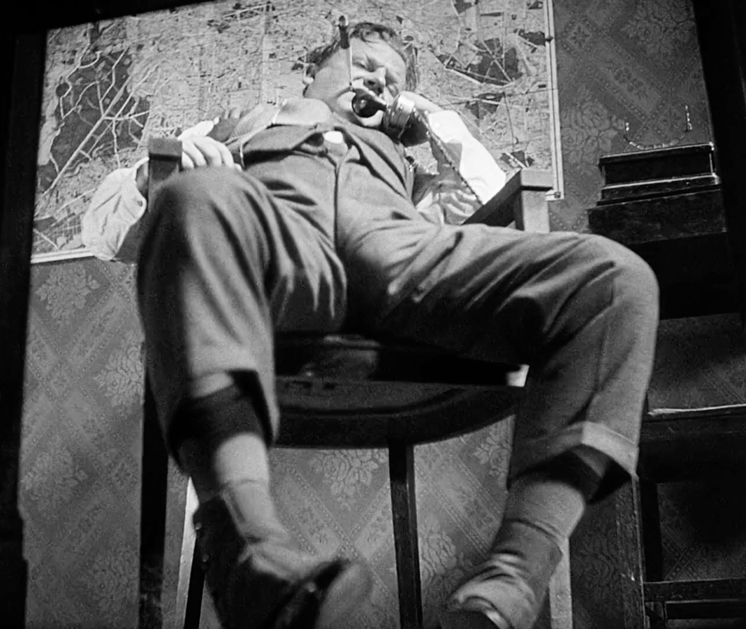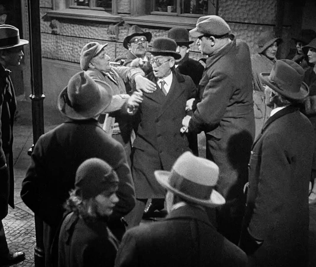 경찰은 커져만 가는 불안에 밤낮으로 일하며 범인을 찾는데 열중하지만 정부에서는 경찰정장에게 경찰의 사정은 모르겠고 빨리 범인이나 잡으라고 압박한다. 장관과의 전화 대화에서 구구절절하게 경찰들의 상황을 브리핑하는 경찰정장의 모습과 함께 그와 연관된 실제 상황 이미지들을 삽입하였는데, 다소 쓸데없이 구체적인 정보까지 나열하며 장관을 풍자의 대상으로 그리는 과정이 재미있었다. 한편, 경찰들은 빈민가를 급습하여 사람들의 신분증을 확인하기도 하는데, 그 과정에서 경찰에 대한 사람들의 비판적이고 풍자적인 태도를 또 한 번 엿볼 수 있다. 꼬리에 꼬리를 무는 흐름으로 기득권에 대한 비판적 시선을 선보이는 프리츠 랑 감독의 연출 방식에 감탄했다. 이어서 경찰을 멀리서 지켜보는 범죄 조직원들을 보이는데, 그들 또한 아동 살인마로 인해 자신들의 이득이 줄어 몹시 화가 난 상황이다. 영화는 의미 없는 회의를 진행하는 조직원과 경찰의 모습을 교차 편집하여 보여주며 두 조직이 결국 크게 다르지 않음을 강조한다. 범죄 조직원들은 거리의 노숙자를 꼬드겨 사람들을 감시하도록 하고, 경찰들은 정신병원에서 나온 위험 대상자들을 전수 조사하기로 한다.