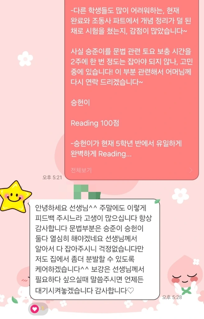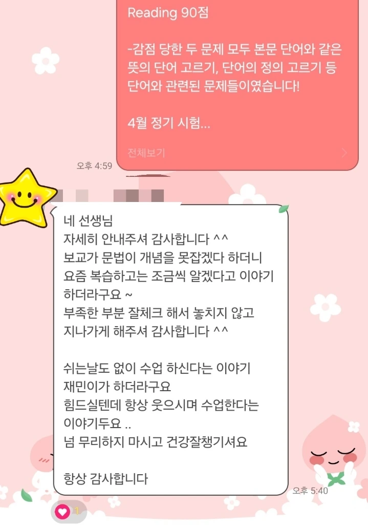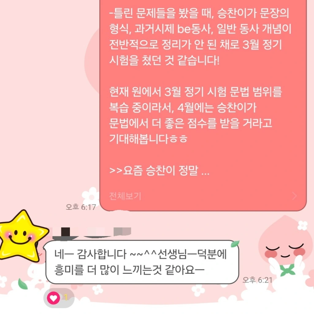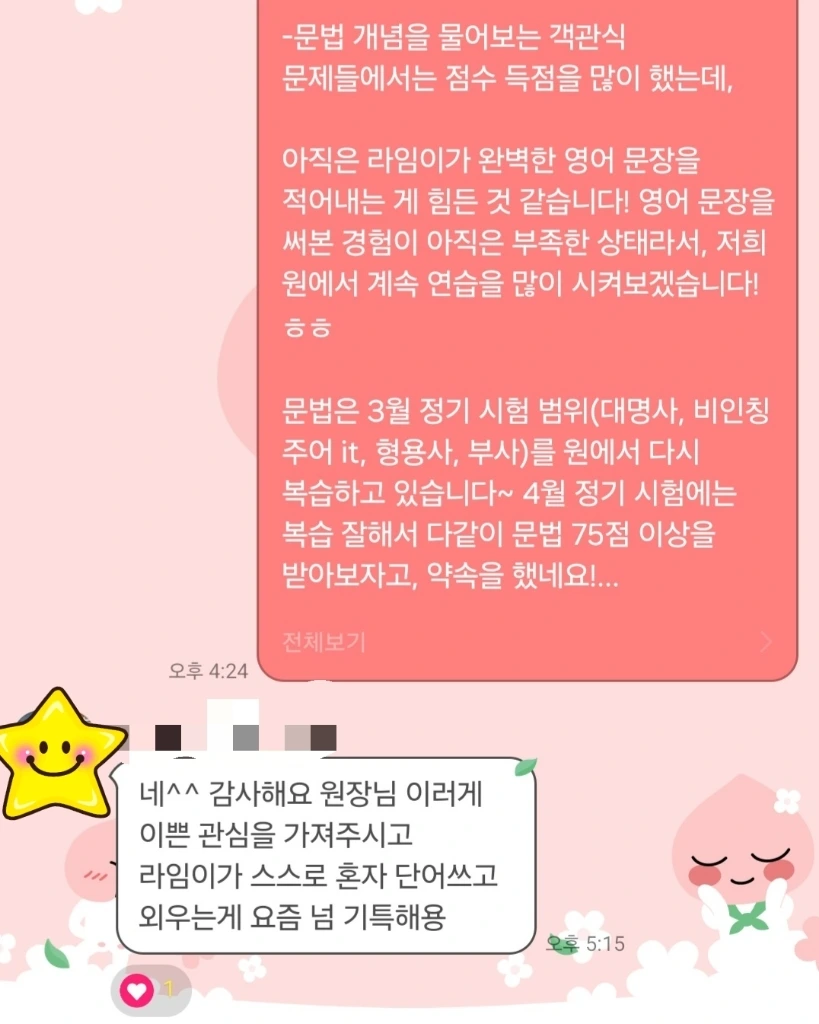 4월 7일 일요일, 3월 25일에 쳤던 정기 시험 분석 피드백을 어머님들께 카톡으로 전달 드렸습니다. 전화를 드리려다가, 날씨 좋은 주말에 다들 밖에 계실 것 같다는 판단에 카톡으로 연락 드렸습니다.