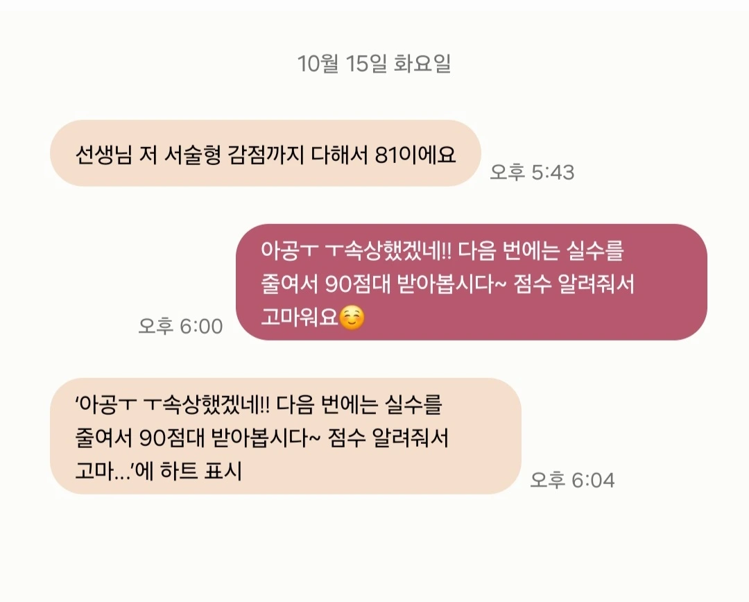 중학교에서 첫 시험을 친 중1들의 문자가 올 때마다, 열심히 중간고사 대비를 한 그 과정을 알기에, 마음이 애틋해진다.