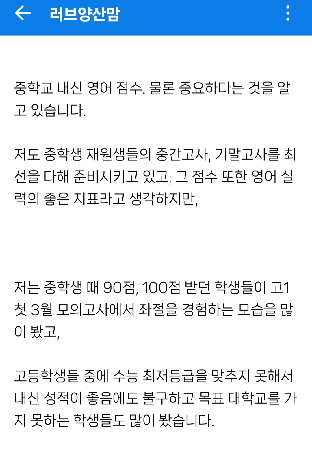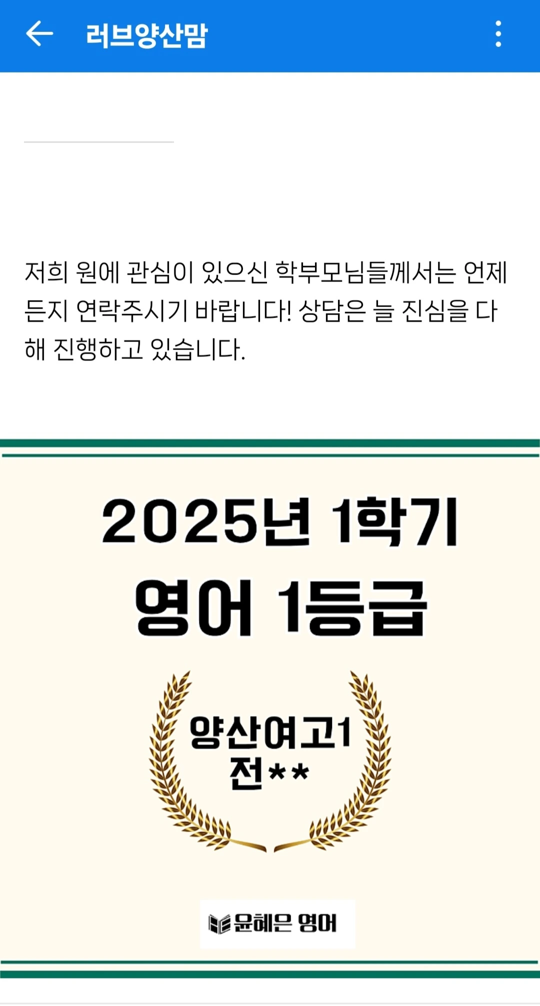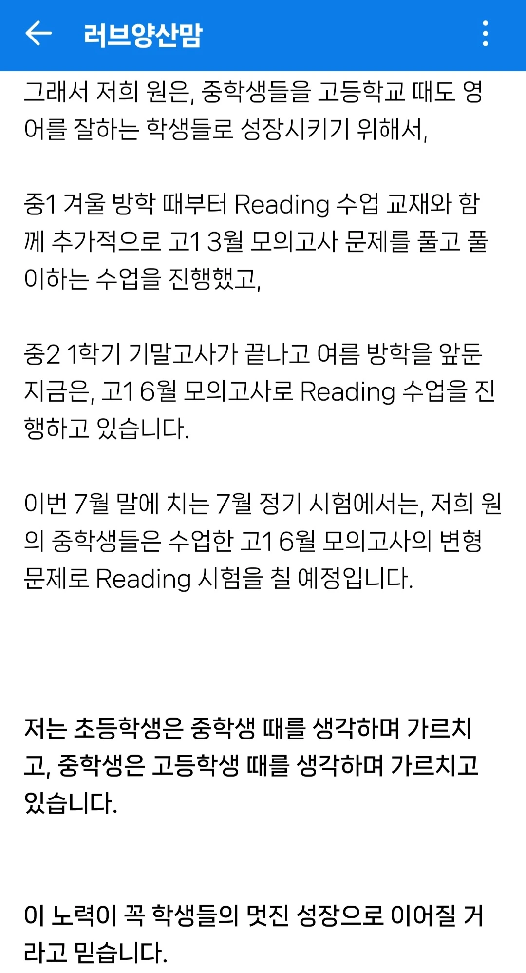 언젠가 한 번은 써보고 싶었던 주제의 글이었는데, 최근의 재원생 학부모님의 전화 한통이 계기가 되어 맘카페 홍보글 하나를 완성해버렸다.