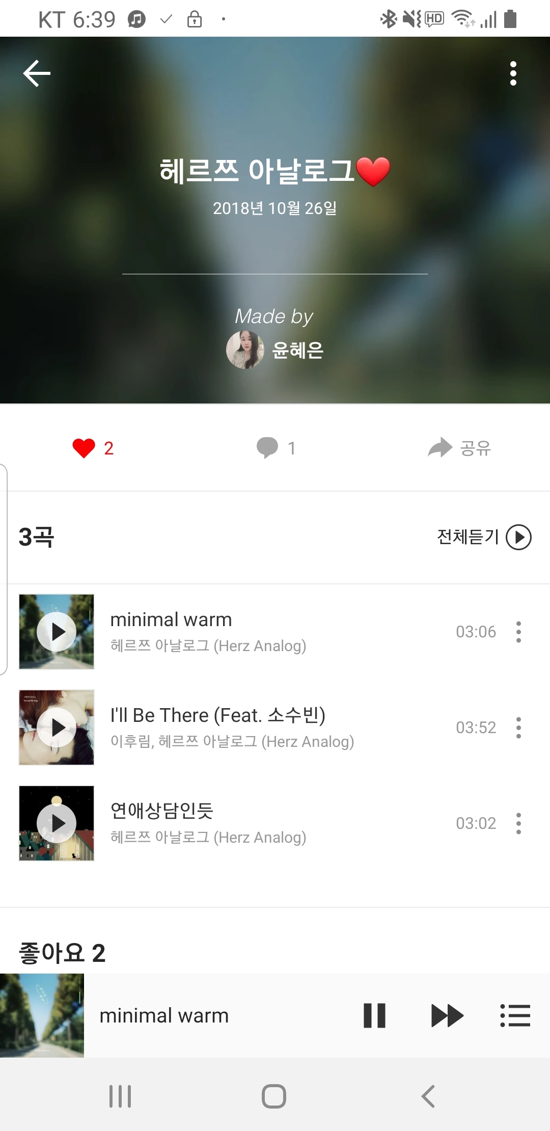 2017년의 'minimal warm'. 헤르쯔 아날로그의 낮은 목소리로 노래 주인공의 마음을 조용히, 가만히 전달하는 곡인데, 정말 매력있는 곡이다.