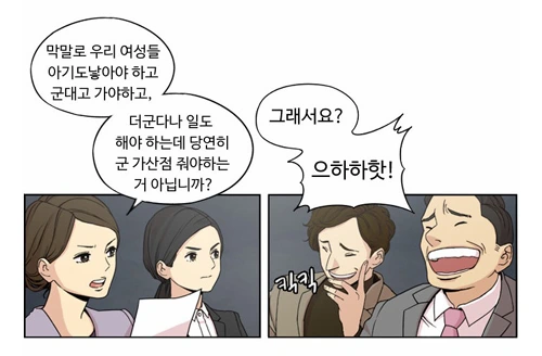 이 만화에서도 군대의 부조리함에 대해서는 끊임없이 질문한다. 아직 회가 거듭되지 않았지만 군생활에 제대로 적응하지 못하는 주인공 중 하나인 수아가 화자가 될 것이라 생각한다.