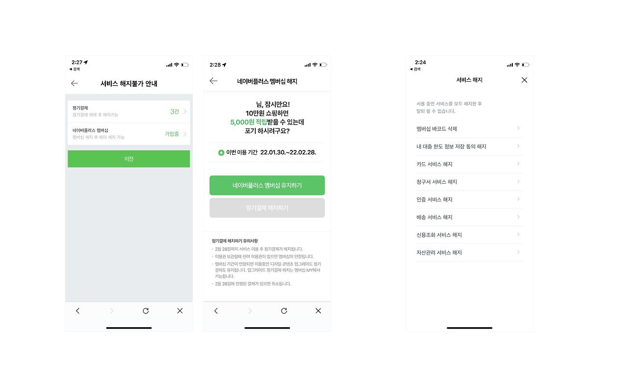 이 모든 장치에도 불구하고 효용성을 느끼지 못했다면 고객은 서비스를 해지하려 할 것입니다. 이때, 편리한 기능과 풍부한 혜택을 다시 한번 강조함으로써 고객의 마음을 전환시킬 수 있습니다. 또한 고객이 연계 서비스를 일일이 해지하는 과정을 두어 서비스의 사용을 재고하도록 만들기도 합니다. 특히, 네이버페이는 플러스멤버십을 해지할 때 놓치는 혜택을 정확한 숫자로 제시하며 사용자를 설득하고 있습니다. 어쩌면 다신 돌아오지 않을 고객을 잡을 수 있는 마지막 순간이기 때문입니다.