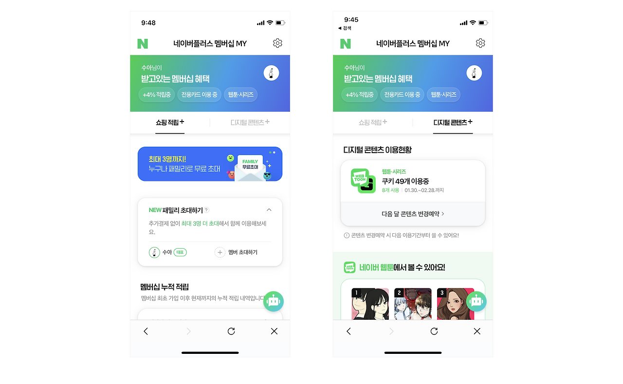 네이버페이는 더 높은 적립 혜택과 디지털 콘텐츠를 앞세워 구독형 서비스인 네이버 플러스 멤버십을 제공하고 있습니다. 멤버십 고객은 네이버페이 결제 시, 최대 5%의 적립금을 받을 수 있으며 계열사의 디지털 콘텐츠를 무료로 이용할 수 있습니다. 뿐만 아니라, 최근에는 패밀리 멤버십을 출시해 결제 건수를 늘리고 고객과의 사슬을 더욱 단단히 묶었습니다.