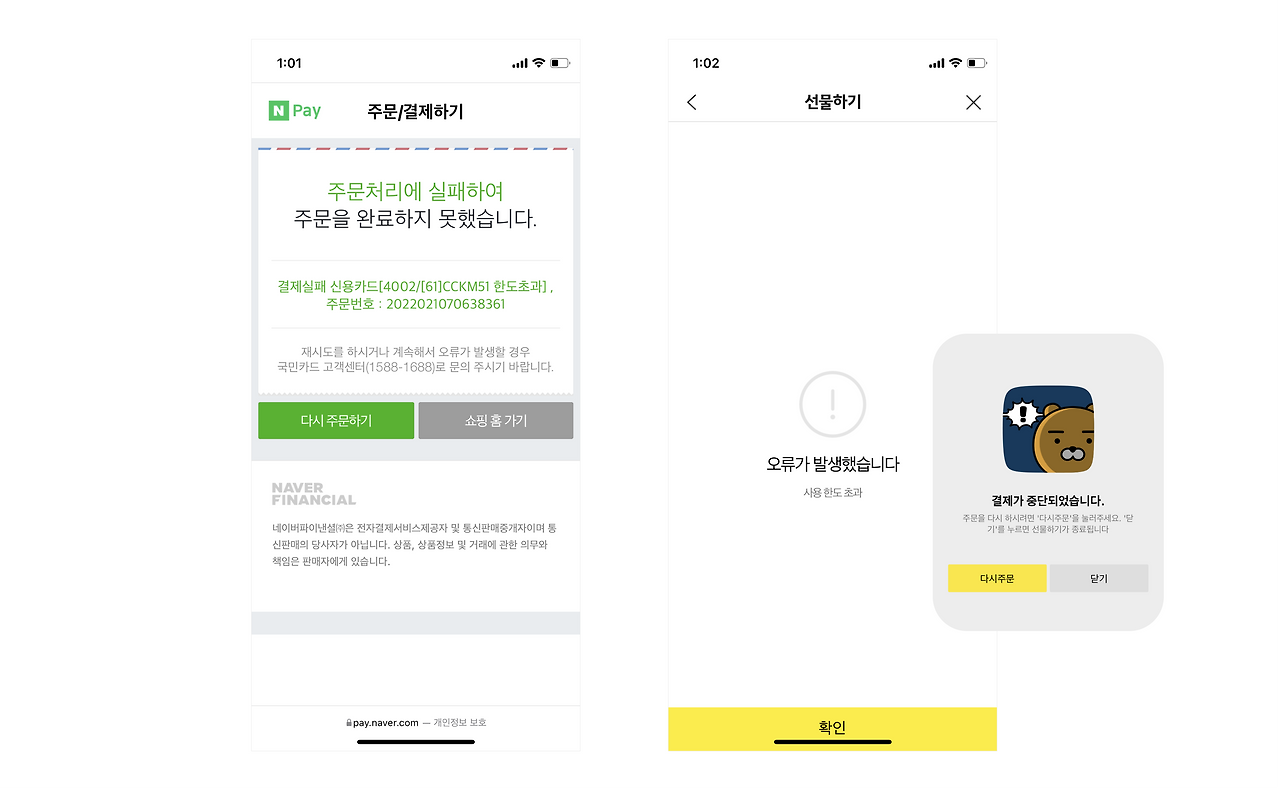 잔액 부족이나 은행 점검 시간 등으로 결제에 실패했을 때, 서비스는 재빨리 유저의 이탈을 막고 다시 주문 창으로 안내해야 합니다. 두 개의 서비스 또한 [결제실패 안내 - 주문서 작성] 순으로 페이지를 연결해 사용자의 재결제를 유도하고 있었는데요. 이때, 눈여겨볼 점은 오류 경험이 번복되지 않도록 결제실패 안내 화면에서 원인을 알려주는 것입니다. 이것은 휴리스틱 원칙에도 해당됩니다. 코드가 아닌 일반적인 언어로 오류를 설명하고 유저가 스스로 솔루션을 찾을 수 있도록 돕는 것이죠.