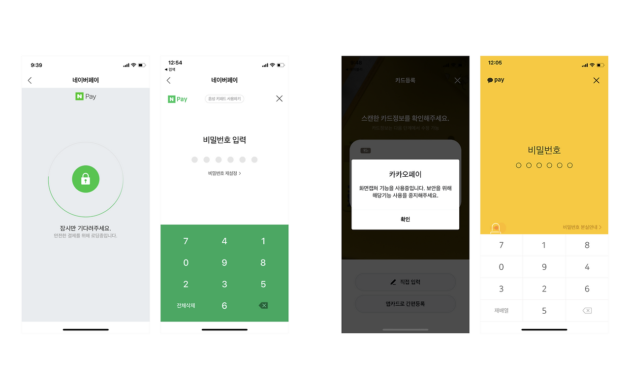 돈이 오고 가는 만큼 보안도 굉장히 중요합니다. 금융 서비스에서 꾸준히 발생하는 보안 이슈를 생각하면 더더욱 그렇습니다. 때문에 핀테크 기업은 고객 신뢰를 얻기 위한 다양한 시도를 하고 있는데요. 비밀번호 입력 시 보안 키패드를 제공하는 것이 대표적인 사례입니다. 각 사의 화면을 살펴보겠습니다. 네이버페이는 결제 대기 화면에서 자물쇠 아이콘과 '안전한 결제'라는 문구로 사용자의 안심을 유도합니다. 카카오페이 또한 비밀번호 입력 창에서 사이렌 이미지를, 캡처 시에는 방지 팝업을 보여주며 보안에 각별히 유의하고 있음을 알립니다.