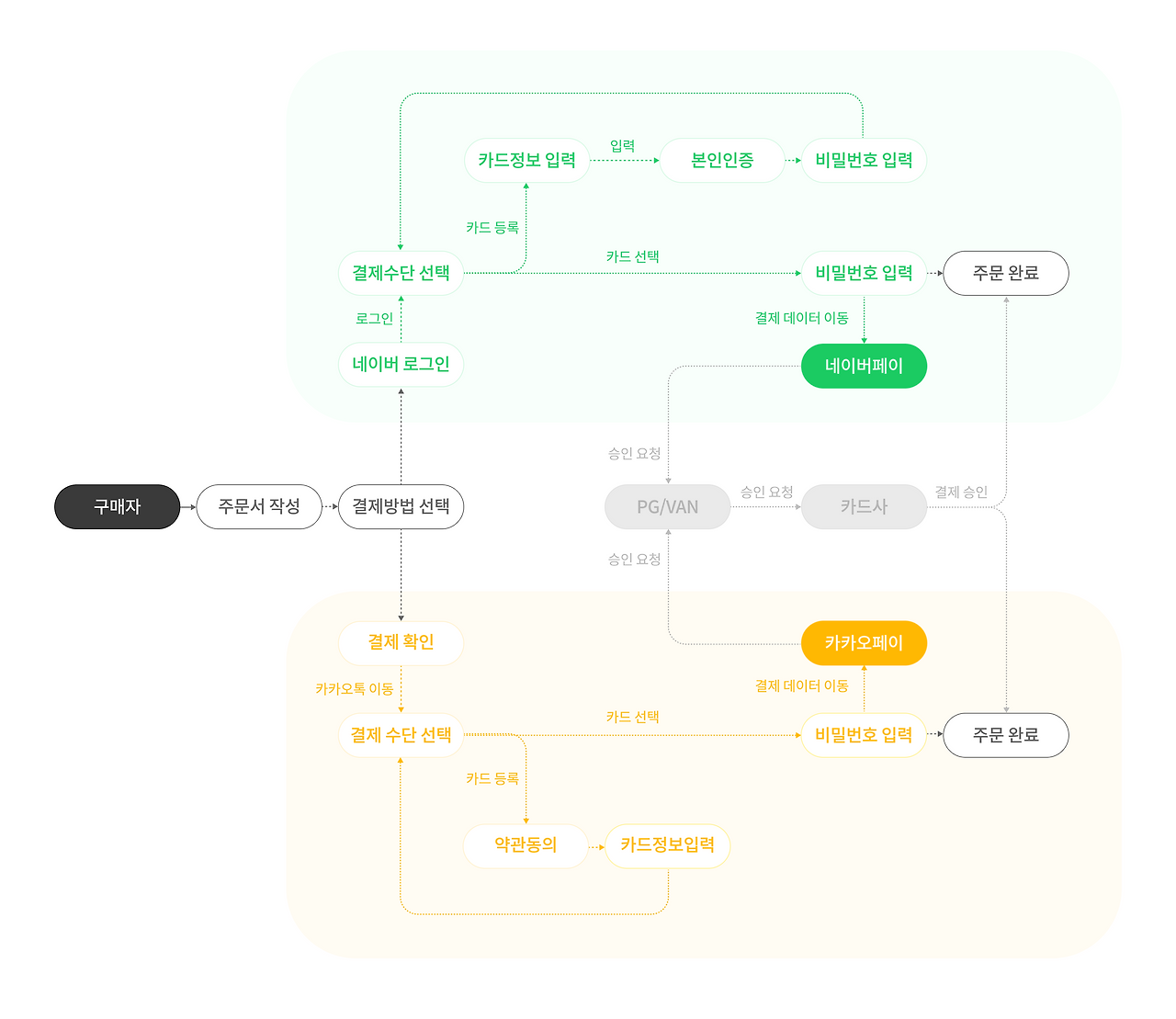 제가 간편결제 서비스를 기획한다면 가맹 플랫폼과의 연계성에 주목할 것입니다. 제휴 서비스에서 간편결제 서비스로 넘어오는 과정과 결제 이후, 다시 제휴 서비스로 돌아가는 과정이 매끄럽지 못하다면 사용자도 서비스 이용에 어색함을 느끼기 때문입니다. 따라서, 가맹 플랫폼의 주문서 작성과 주문 완료 화면을 바탕으로 서비스 맥락을 고려해 유저 플로우를 설계하는 것이 중요하다고 생각했습니다.