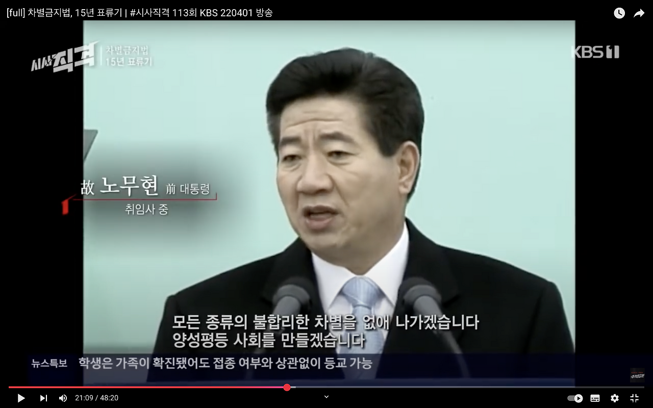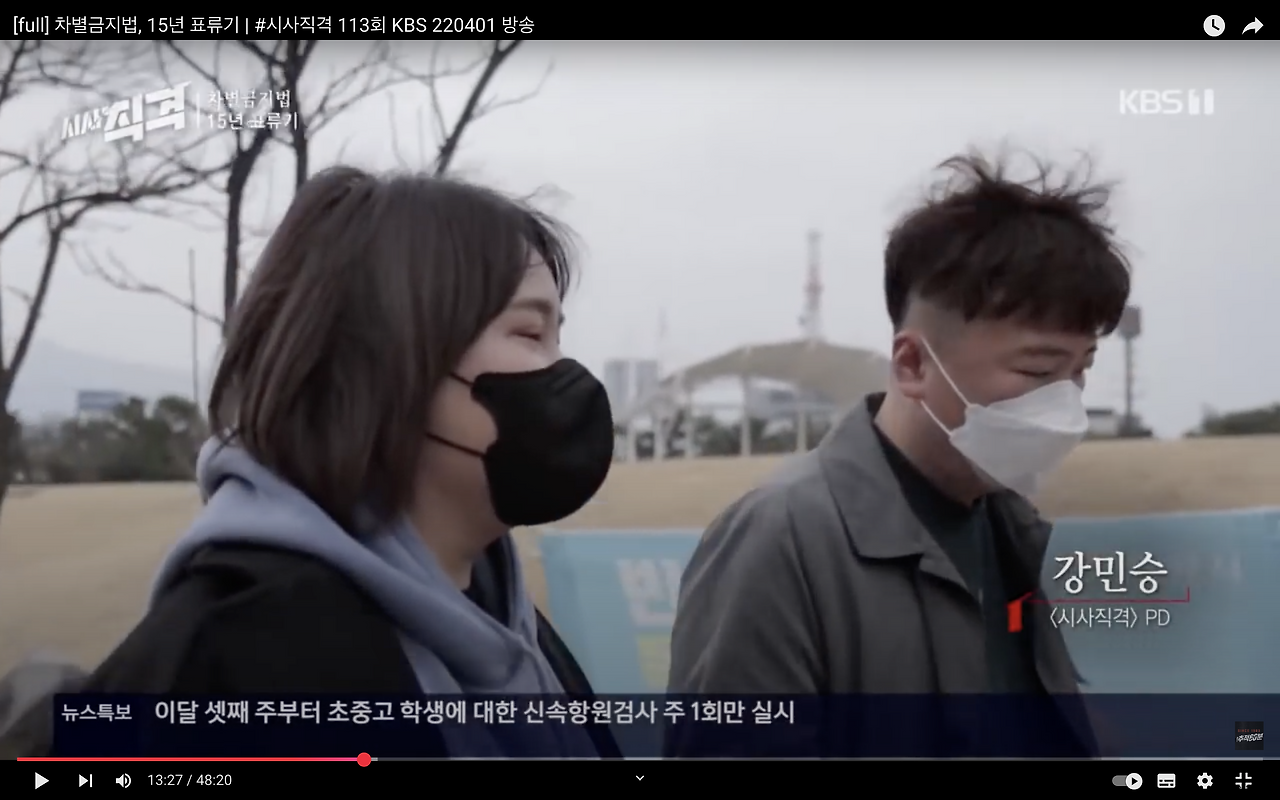 관련하여, 나는 2022년 4월 1일 방송된 KBS 〈시사직격〉‘차별금지법, 15년 표류기’ 편을 연출하며, 인권 선진국을 자임하는 대한민국에서 포괄적 차별금지법 제정이 여전히 요원하다는 사실을 고발한 바 있다. 실제로 방송 직후, 나는 연출자로서 각종 항의와 민원, 소송에 휘말렸다. 일부 종교단체가 '차별금지법, 15년 표류기' 편이 편향됐다면서 시청자항의청원을 올렸고 동의자가 1,000명을 넘어서면서 나는 관련 답변을 준비해야 했다. 국민 대다수가 반대하는 차금법 제정을 공영방송의 시사프로그램이 하루 빨리 제정되길 촉구하는 것은 공정과 공익에 어긋난다, 소수를 위한 그 법은 다수에 대한 역차별이라는 것이 주요 요지. 그러나 이는 사실과 다르다. 포괄적 차별금지법 제정에 대한 국민 여론은 찬성이 우세하다. 여론조사 기관인 한국갤럽이 2022년 6월 실시한 조사에 따르면, 제정 찬성 여론은 57%에 달했다.