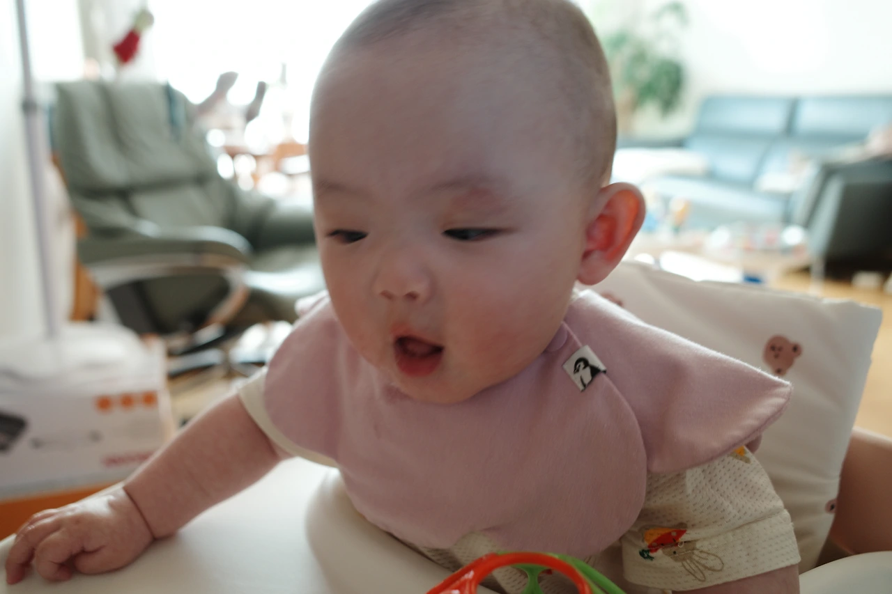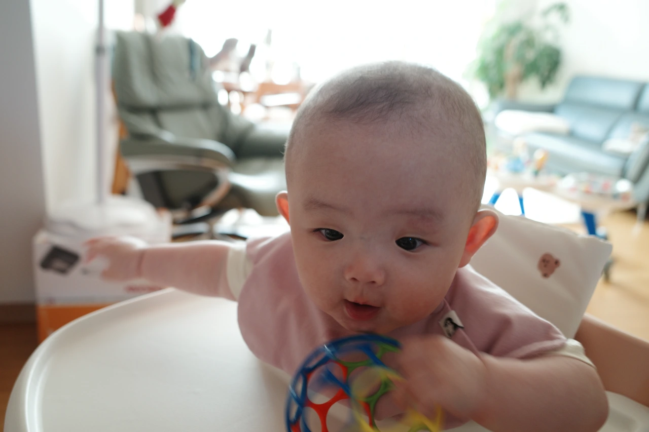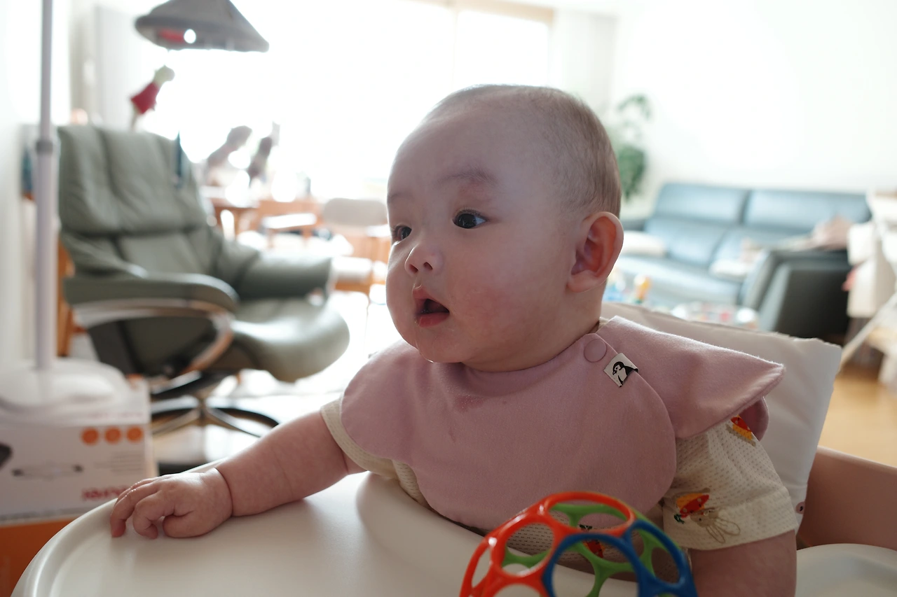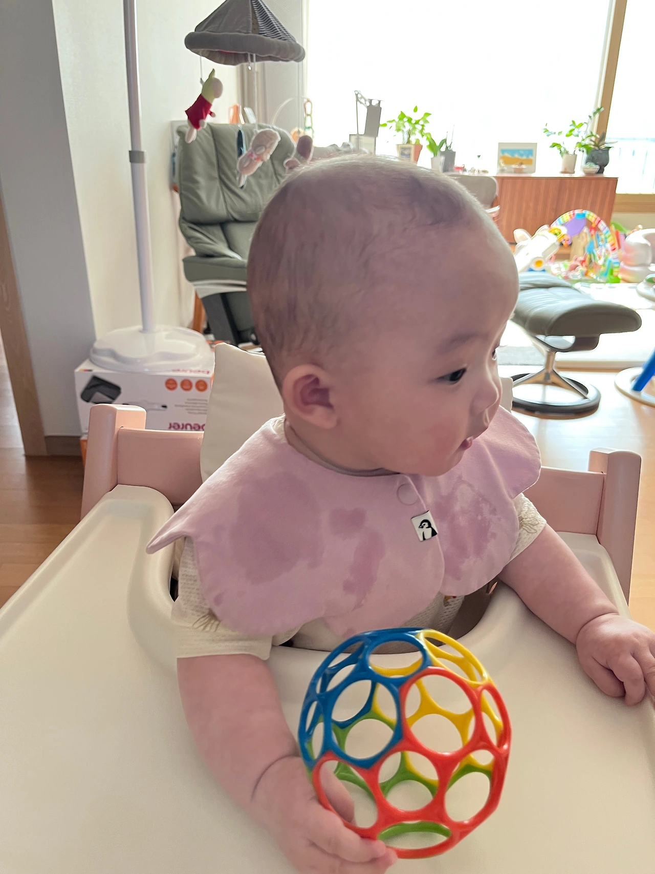 이유식을 시작하려면 그녀가 받아먹을 의자가 필요하다. 옆지기가 부품을 몇 주 전부터 눈앞에 보이는 곳에 꺼내놓았지만, 내심 ‘지아가 아직 앉기에는 무리인 것 같아.’라는 생각이 앞서 의자 조립을 미루어두었다. 오늘에서야 의자 조립을 마치고 그녀를 앉혔는데 세상에나.