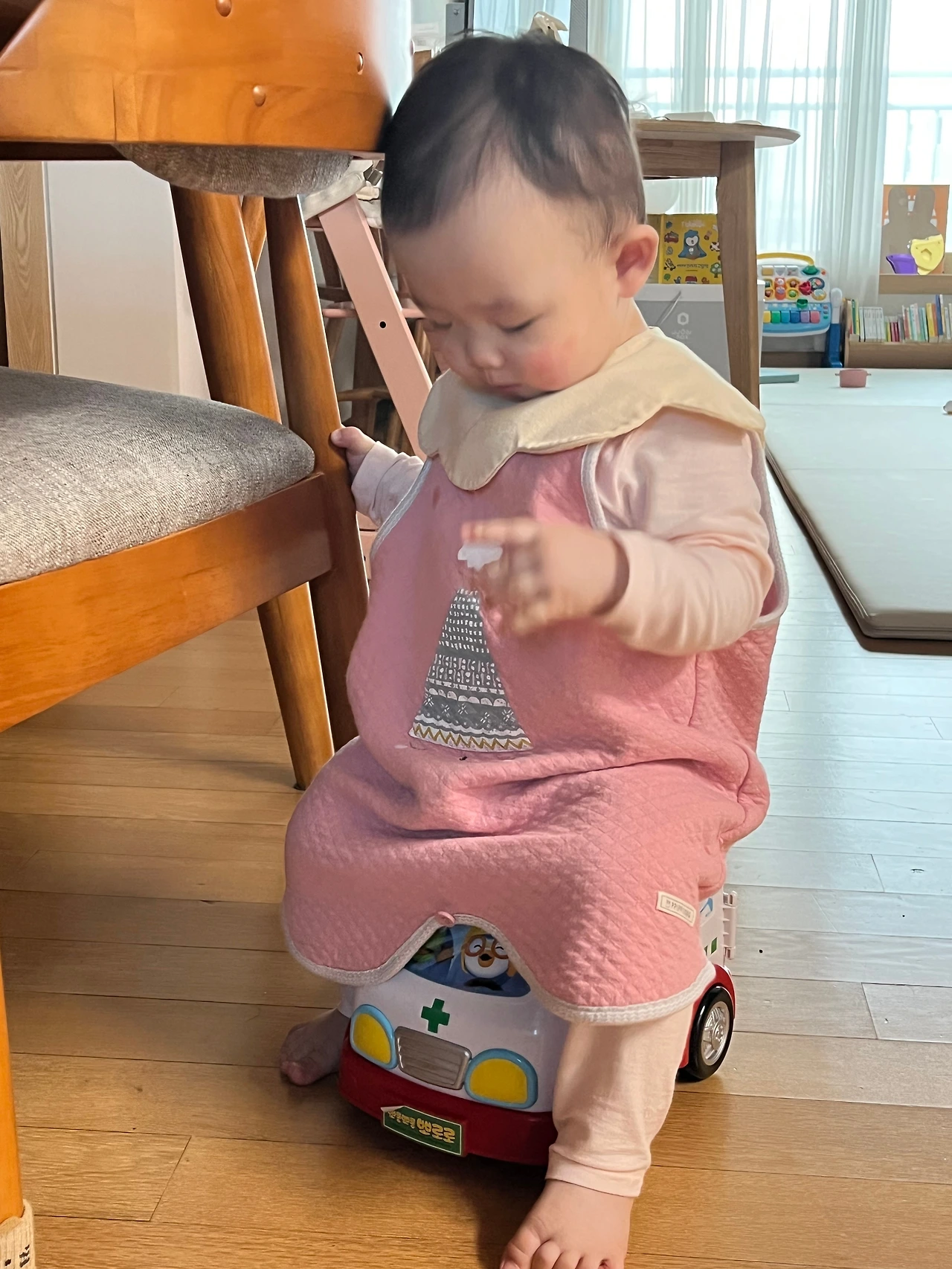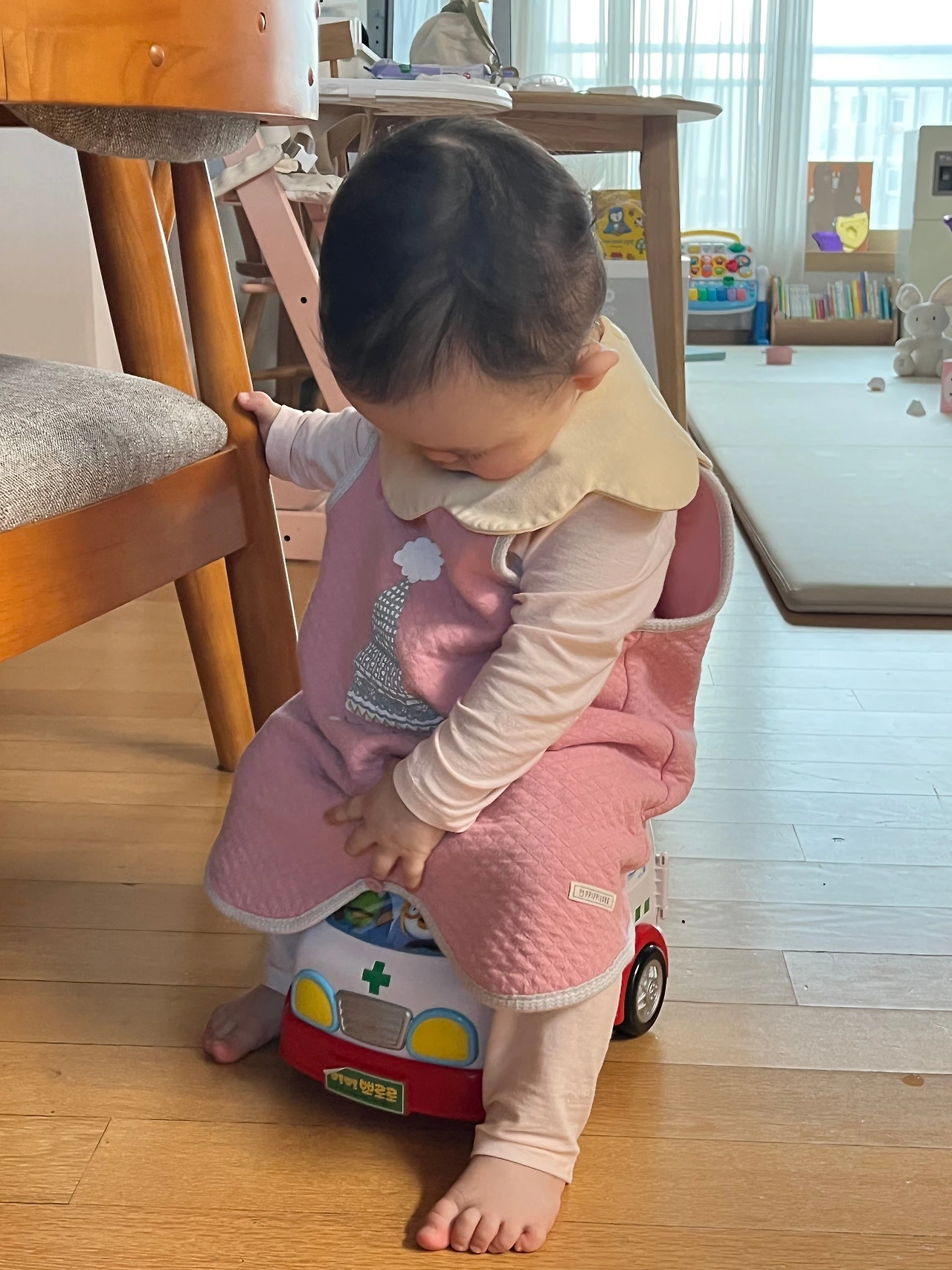 그녀의 자동차 편력을 심각하게(?) 생각하게 된 계기는 얼마 전에 생겼다. 장난감 엠뷸런스 자동차 위에 그녀가 자기 엉덩이를 욱여넣기 시작한 것이다. 억지로 맞춰 찬 차를 연신 앞뒤로 흔들며 운전하려는 모습은 너무 애처롭고 귀여웠다.