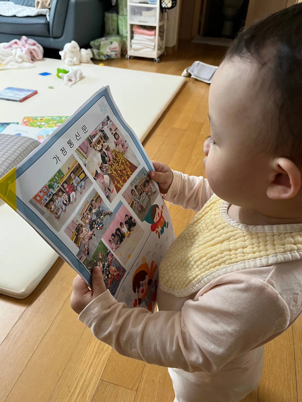 요즘은 책을 들고 와 내게 ”어 “ 혹은 “응”이라는 단어를 말한다. “읽어줄까?” 하면 책을 내게 주고 다리 위에 앉거나 옆에 선다. 그녀가 사랑스럽다.