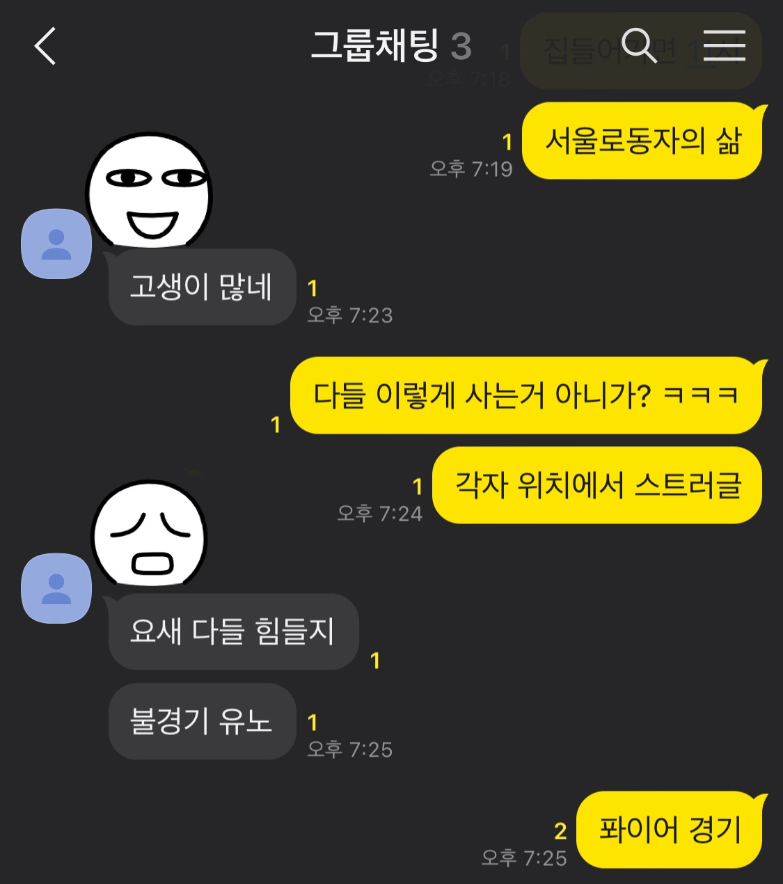 *퐈이어 경기= 불경기를 따라 말하는 아재 ver 번역. 의미 없는 단어. 고생이 많다는 친구의 말에 무안함을 숨기기 위함.