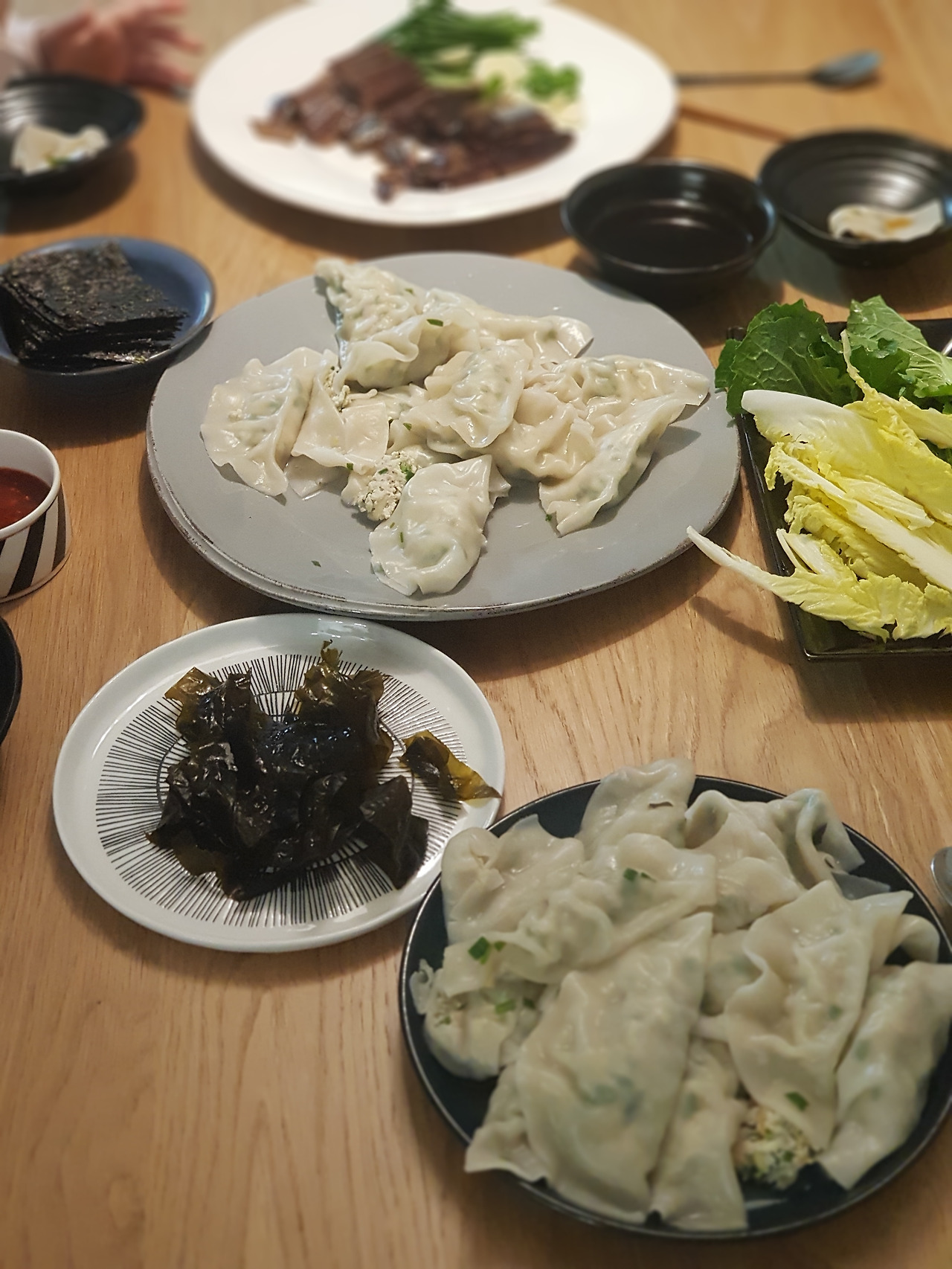 만두소가 담긴 양푼을 테이블 위에 올리고 식구들 수만큼 숟가락을 꽂는다.