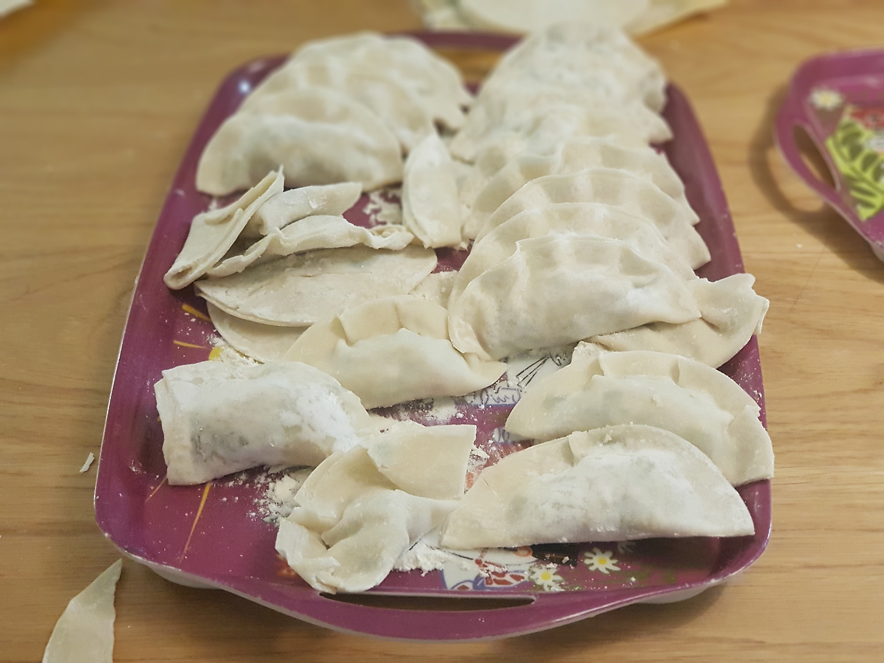 빚어진 만두를 올려놓을 쟁반 위에는 하얀 밀가루를 뿌리고 작은 종지에는 물을 떠서 놓는다. 아이들과 송편은 빚어 봤지만 만두는 처음이다. 아이들에게 시범을 보여준다.