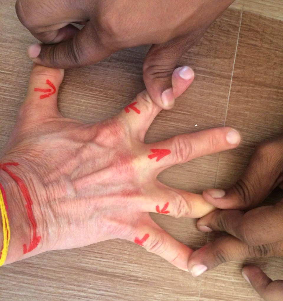 손가락은 최대한 쫙 펴주고, 특히 검지와 곤지가 서로 안쪽으로 힘이 들어갈 수 있도록 조절한다. 팔꿈치가 바깥으로 향하게 팔을 펴주고 어깨 역시 안쪽으로 움츠러지지 않고 허리와 함께(허리와 연결되어 펴지는 느낌이 든다) 펴준다. 엉덩이는 최대한 위로 들어 올려주고 어깨와 허리를 엉덩이 쪽으로 밀어주며 펴준다.