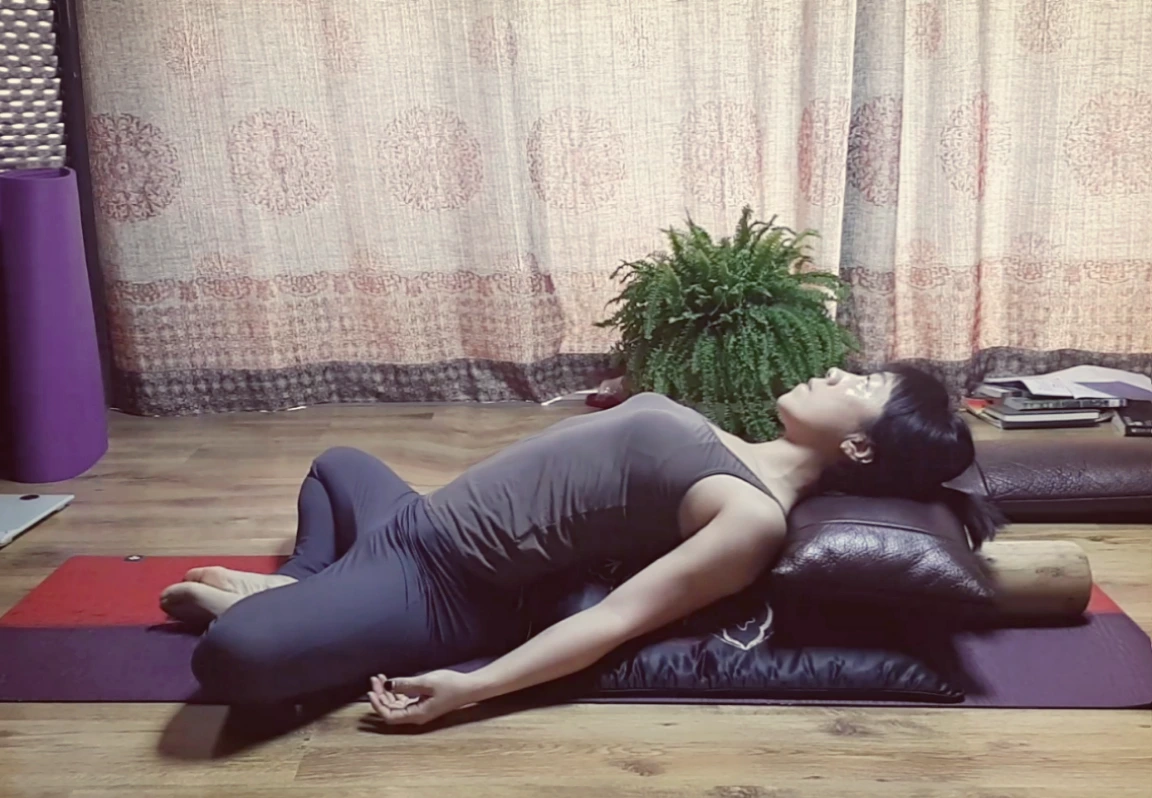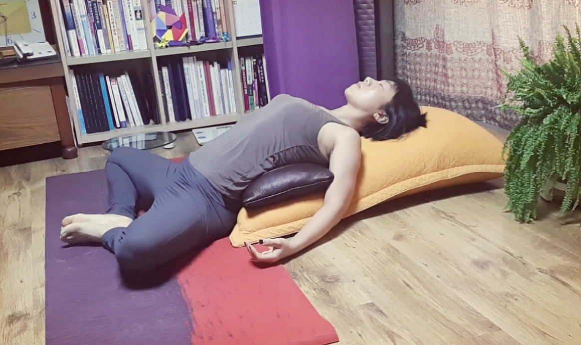 임산부와 생리 중인 여성들에게 좋은 자세다. 고관절을 풀어주고 하체 혈액순환을 돕기 때문에 불면증과 허리 통증이 있는 분들에게도 권하고 싶다. 상체를 숙이기 전 나비 자세로 앉는다. 딱딱한 쿠션이나 담요를 두껍게 말아서 등 뒤에 바짝 당겨 놓는다. 천천히 쿠션이나 담요 위로 눕는다. 머리는 상체보다 조금 높거나 같은 높이를 유지하도록 한다. 팔은 자연스럽게 옆에 두고 심호흡을 천천히 한다. 일어설 때에는 오른쪽으로 몸을 기울여(허리에 무리가 가지 않게) 천천히 일어난다.