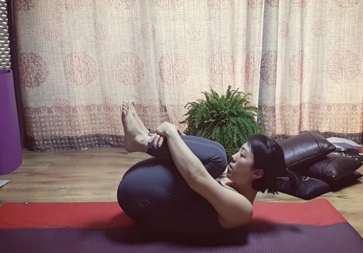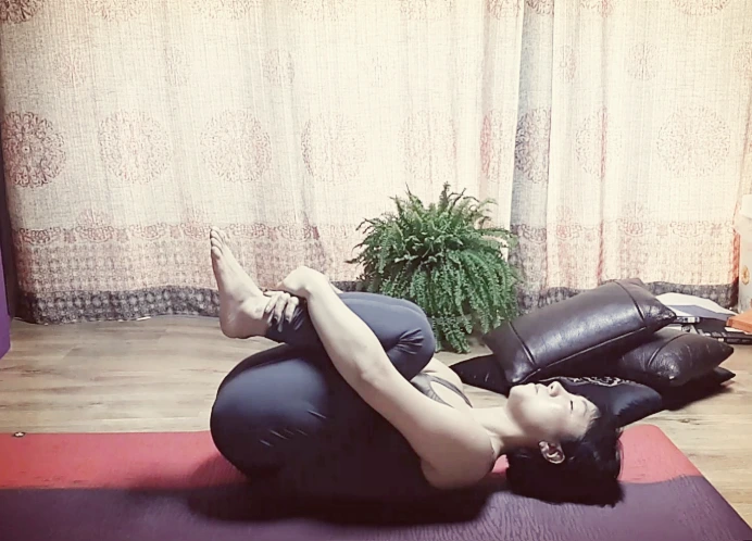 나비 자세로 열린 골반을 다시 닫아주는 Supta Pawanmuktasana자세로 마무리한다. 바닥에 누워 무릎을 구부리고 무릎 아래 정강이를 팔로 안아 준다. 양 무릎을 가슴에 닿도록 당긴다. 깊게 숨을 들이마시고 내쉬는 숨에 머리를 들어 무릎 쪽으로 당겨 준다. 5초 유지 후 다리를 내린다.