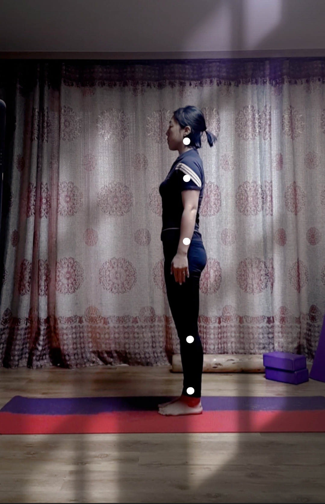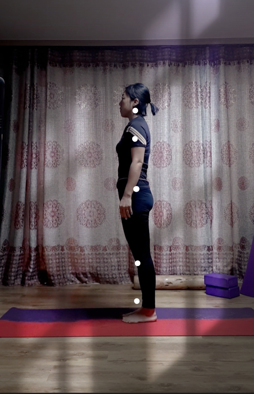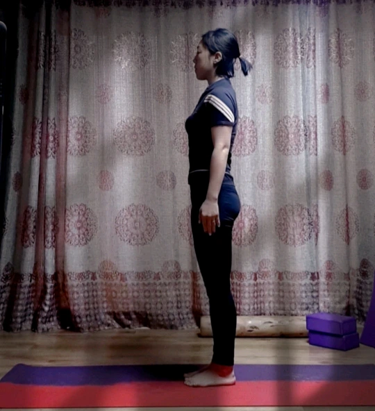 내 몸도 골반이 앞으로 쏠려서 허리가 과하게 신전 되고[(] 긴장된 상태였고 지지하는 발은 뒤꿈치에 무게가 실렸다. 한참 몸무게가 올랐을 때 발 뒤꿈치에 티눈이 여러 개 생겨서 고생한 기억이 있는데 살이 쪄서라기 보다 무게가 뒤꿈치에만 실렸던 것이 큰 이유였다. 반면 산 자세로 자세를 교정하고 난 후 서 있는 모습은 균형이 잡혀 있다. 의식적으로 가슴을 펴고 배를 안으로 당긴 후 허벅지와 무릎도 안쪽으로 당기면 자연스럽게 허리가 펴진다.